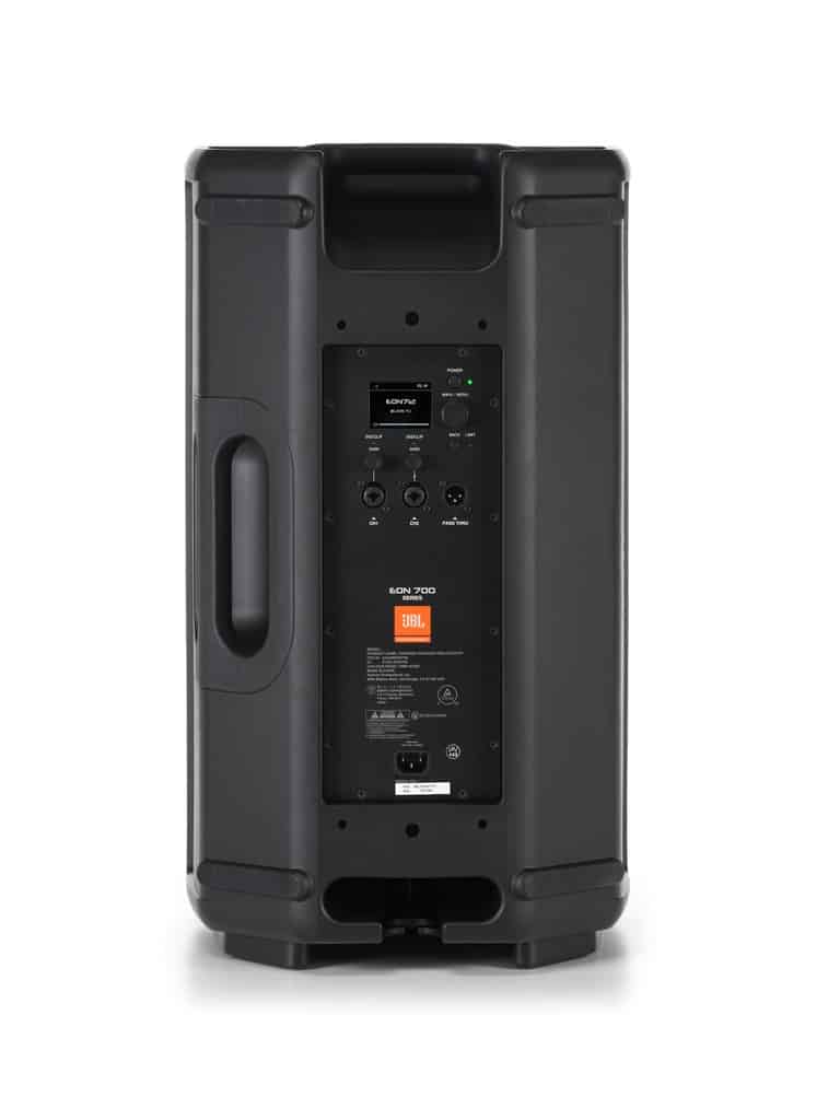 Widok głośnika EON712 z tyłu – tutaj znajdziemy wszystkie gniazda, a także panel sterowania z wyświetlaczem.