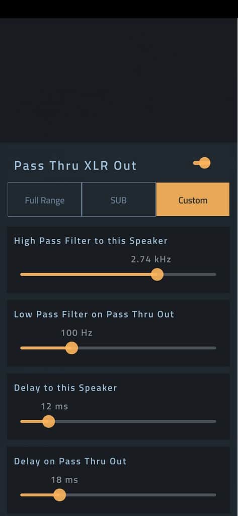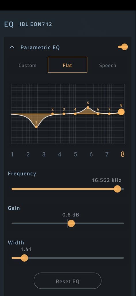 JBL EON712 to aktywny głośnik, wyposażony we wzmacniacz klasy D o mocy szczytowej 1300 W (650 RMS). Charakteryzuje się cichą pracą, dużą wydajnością i doskonałym, czystym dźwiękiem – bez względu na to, jak głośno jest reprodukowany. Na wejściu wzmacniacza znajduje się mikser pozwalający na podłączenie dwóch różnych sygnałów monofonicznych za pomocą wspomnianych przed chwilą gniazd Combo – mogą to zatem być mikrofony, źródła liniowe (instrumenty, odtwarzacze, wyjścia z miksera głównego itp.). Ich poziomy ustawia się indywidualnie. Z kolei za pomocą wyjścia Pass Thru możemy wyprowadzić sygnał i przekazać do kolejnych głośników. W menu edycyjnym mamy do dyspozycji różne presety, pozwalające na określenie, co dokładnie chcemy przesłać dalej – poczynając od materiału tożsamego z tym, który napędza sam głośnik (zatem pełnego zakresu), poprzez sygnał dedykowany subwooferowi (wówczas na wyjściu Pass Thru włączy się filtr odcinający powyżej 80 Hz, zaś sygnał powyżej tej granicy napędzi testowany model), aż po ustawienia własne użytkownika, z określaniem częstotliwości odcięcia filtra. Na tym wyjściu można także dodać opóźnienie o odpowiedniej wartości, kompensujące ustawienie kolejnego głośnika na sali. EON712 obsługuje Bluetooth 5.0, zarówno w celu sterowania za pomocą aplikacji w urządzeniu mobilnym (o której będzie jeszcze mowa), jak i bezprzewodowego odtwarzania z tabletu, smartfonu itp. Oczywiście jest także wyposażony w zaawansowany procesor DSP z licznymi algorytmami efektowymi, ale o tym opowiem w dalszej części tekstu.
