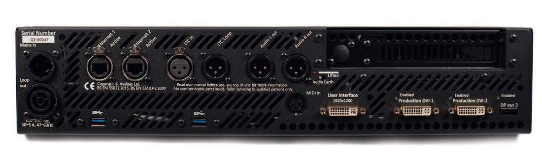 Dysk systemowy ma pojemność 120 GB, a systemem operacyjnym jest Windows 10. Komputer posiada również napęd przeznaczony na multimedia o pojemności 1 TB. Tylna płyta to właściwie same złącza. Co do najważniejszych złącz: znajdziemy tu trzy porty wyjściowe wideo DVI, gdzie dwa można potraktować jako produkcyjne, a jedno z nich służy do podglądu interfejsu użytkownika. To jednak nie wszystko: dodatkowym złączem produkcyjnym jest Display Port mogący generować rozdzielczość 4K. Same złącza można uaktywnić oraz określić ich rozdzielczość za pomocą wyświetlacza oraz przycisków nawigacji w przedniej części obudowy Q3.