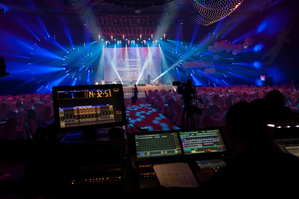 Z pewnością najbardziej znanym i najpopularniejszym konkursem wyróżniającym najlepszych sportowców danego roku jest plebiscyt organizowany przez „Przegląd Sportowy”. Spora część z nominowanych i nagradzanych w nim sportowców jest mieszkańcami Warszawy. 13 lutego br. stolica postanowiła wybrać najpopularniejszego sportowca oraz sportową imprezę roku już po raz piętnasty, nagradzając sukcesy swoich znanych mieszkańców. Chociaż produkcji nie towarzyszy taki rozmach jak w ogólnopolskim plebiscycie, to jednak tegoroczna, jubileuszowa edycja może pochwalić się bardzo rozbudowanym anturażem, o który zadbały Stołeczna Estrada, Pro4Media oraz firma Groda, która przywiozła do Areny Ursynów kilka zupełnie nowych urządzeń. Sukcesy sportowców wywodzących się czy mieszkających w Warszawie są niewątpliwym powodem do dumy zarówno dla samego miasta, jak i stołecznych włodarzy. Okazją, aby podziękować za godną reprezentację stolicy i jej promocję oraz pogratulować sukcesów i wyróżnić tych najpopularniejszych sportowców, jest zorganizowany w tym roku już po raz piętnasty Plebiscyt na Najlepszych Sportowców Warszawy. Głosy na sportowców były zbierane na specjalnie stworzonej stronie internetowej, a także na stronach urzędów dzielnic, ośrodków sportu i rekreacji oraz stronach partnerów wydarzenia od 9 stycznia do 6 lutego. Nagrody zostały przyznane 13 lutego na gali zorganizowanej w Arenie Usynów. Wyróżniono m.in. najlepszego sportowca roku, trenera roku, sportową osobowość roku i nadzieję olimpijską. Oprócz niewątpliwych wyrazów sympatii, laureat tytułu Najlepszego Sportowca Roku został także Sportową Twarzą Warszawy 2015 roku. Po raz kolejny tytuł ten otrzymała Anita Włodarczyk. Pierwszym krokiem w przygotowaniach do realizacji jubileuszowego, XV Balu Mistrzów Sportu Warszawy było spotkanie, w którym uczestniczyła firma Groda, scenograf Cezary Ponikiewski oraz Stołeczna Estrada. Odbyło się ono w Arenie Usynów, w której zrealizowane zostało całe przedsięwzięcie. W trakcie spotkania ustalono podział poszczególnych elementów produkcji między ekipy. Ze względu na fakt, że Stołeczna Estrada dysponuje swoim sprzętem oświetleniowym, jak i konstrukcjami, ustalono, że po stronie Stołecznej Estrady będzie zapewnienie klimatu w hali oraz w foyer, natomiast firma Groda skupi się na wyglądzie sceny oraz multimedialnym żyrandolu. Po ustaleniu wszystkich elementów przystąpiono do rysowania całego projektu w programie WYSIWYG Perform R34. Przed przystąpieniem do wieszania oświetlenia w hali, trzeba było oczywiście podwiesić konstrukcje pozwalające na instalację poszczególnych opraw w wynikających z projektu miejscach. Możliwości podwieszeniowe hali to 300 kg co węzeł, który przypada mniej więcej co 4 m. Wysokość hali to natomiast 12,6 m do belki. Wszystkie podwieszenia w przypadku tej produkcji były zrobione przez alpinistów. Jest też druga metoda ich realizacji, czyli zrobienie podwieszeń z wózka, lecz – jak przyznała ekipa – podwieszenia alpinistyczne znacznie skróciły czas montażu. Jak już wspomnieliśmy, konstrukcje pod światło kontrowe i front zapewniła Stołeczna Estrada, natomiast firma Groda dostarczyła boczne łuki na scenie – było to koła o średnicach 3, 5 i 8 m firmy Prolyte. W obrębie hali, nad stolikami, przy których zasiedli zaproszeni goście, zainstalowano sześćdziesiąt PAR-ów CP62 z filtrami L105 (orange) oraz L129 z filtrami frost. Oprawy te dostarczyła Stołeczna Estrada. Firma Groda przywiozła dwa mocne urządzenia Clay Paky Alpha Profile 1500, które pozwoliły wyświecić na czarnym materiale gobo z wizerunkami sportowców. Bardzo interesującym elementem, który znacząco podniósł walory wizualne całej oprawy, był żyrandol zainstalowany w centralnej części hali. Jego instalacja przebiegła w sposób kilkuetapowy. Pierwszy krokiem było podwieszenie konstrukcji w formie krzyża o długości ramion wynoszącej 8 m, wykonanego z kratownic Prolyte H40R. Do tego elementu, w miejscu, gdzie przecinały się kratownice, z pomocą steelfleksów przypięto koła o wielkościach 5 i 12 m. Do wewnętrznej części pięciometrowego koła ekipa zawiesiła szesnaście sterowników TLD-612 firmy SGM. Z każdego sterownika wychodziło trzydzieści sześć pasków SGM LB-100 (sześć wyjść razy sześć kurtyn LB-100) przyczepionych do zewnętrznego koła.Projekt całej przestrzeni został przygotowany w taki sposób, by osią wszystkich wydarzeń była scena wypełniająca wraz z wingami scenograficznymi jeden z boków hali. Naturalnie największa część opraw oświetleniowych została zainstalowana właśnie na scenie i w jej bezpośrednim sąsiedztwie.Oświetlenie frontowe sceny zrealizowano z pomocą ośmiu fresneli 2 kW, czterech spotów Martin MAC 700 Profile dostarczonych przez firmę Groda oraz dwunastu opraw DTS Nick Wash, które zapewniła Stołeczna Estrada. W kontrze zainstalowano dwanaście modeli Sunstrip ACT marki Showtec dostarczonych przez Estradę, a także jedenaście Martin MAC Aura, sześć Clay Paky Alpha Beam 300 oraz trzynaście Robe Robin BMLF – wszystkie przywiezione przez rentalowca z Ostrołęki. Jako oświetlenie publiczności zainstalowano cztery Blindery 4DWE. Firma Groda ma od niedawna w swoim parku oświetleniowym oprawy Robe Robin BMLF. Już po pierwszych realizacjach wszyscy zgodnie przyznali, że są to świetne lampy, odznaczające się bardzo wysokimi parametrami świetlnymi i dużą jasnością przy równoczesnej relatywnie niewielkie wadze. Egzemplarze Robe Robin BMFL, które zainstalowano na omawianej produkcji, przyjechały wprost z firmy Prolight, polskiego dystrybutora marki. Jak przyznała firma Groda, lampy wybrano przede wszystkim ze względu na fakt, że potrzebowano urządzenia typu spot z CMY, które w kolorach i z gobosami przebije się przez washe. BMFL oczywiście nie miał z tym najm