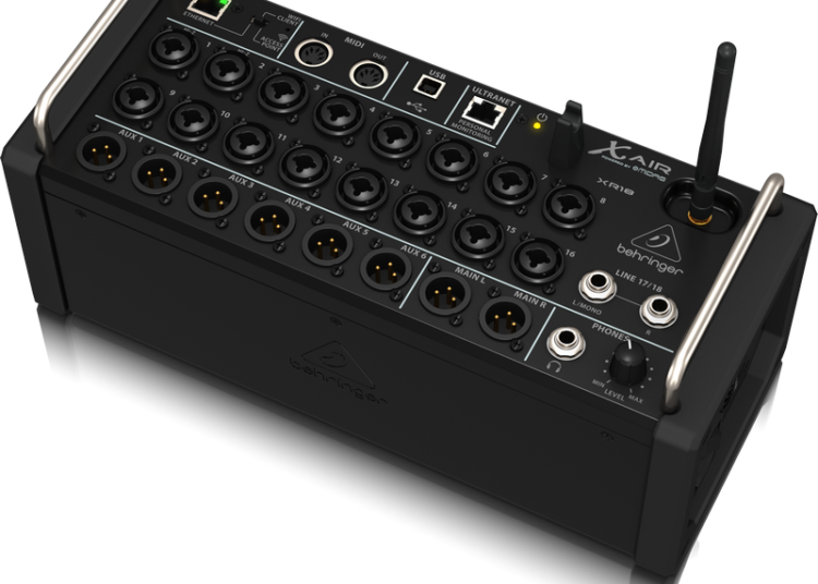 Korporacja Music Group, do której Behringer należy, od kliku lat pochłania cenione marki, a co za tym idzie – również ich inżynierów i technologie. Wymienić można tu choćby Midasa, Klark Teknik czy też TC. Owocem tych zmian jest seria mikserów X. Cała seria X32 została świetnie przyjęta przez realizatorów na całym świecie i ciężko nie odnieść wrażenia, że w tym przedziale cenowym jest bezkonkurencyjna. Tym razem mamy do czynienia ze sprzętem nieco innym. Wymagania klientów bywają różne, podobnie jak warunki, w których przychodzi nam realizować dźwięk. Bywa tak, głównie podczas mniejszych zleceń, że organizator nie jest w stanie lub nie chce zapewnić stanowiska, na którym moglibyśmy rozłożyć pełnowymiarowy stół. Bywa również tak, że zlecenie niekoniecznie wymaga aż tak zaawansowanego sprzętu. Właśnie wtedy z pomocą przychodzą nam zdalnie sterowane miksery rackowe lub urządzenia w formie stageboxów. Małe, mobilne, ergonomiczne, niemalże niewidoczne na scenie, no i przede wszystkim – zdecydowanie tańsze. Takim właśnie produktem jest Behringer X-Air XR18. X-Air Seria X-Air to cztery miksery różniące się od siebie zarówno wyposażeniem, jak i budową. W serii tej, poza testowanym XR18, znajdziemy również: XR12, XR16, oraz X18 (model zintegrowany z dockiem do iPada). Wszystkie urządzenia w serii X-Air zostały pozbawione fizycznej warstwy sterowania, dzięki czemu oferują wiele funkcji dostępnych u „większych braci” z serii X32, w maksymalnie zminimalizowanej obudowie przy minimalnych kosztach. Budowa i pierwsze wrażenia W opakowaniu poza samym mikserem znajdziemy kabel zasilający oraz uchwyty umożliwiające montaż w racku. Ciężko powiedzieć o XR18, że prezentuje się okazale. Jest naprawdę niewielki, ale sprawia wrażenie solidnie wykonanego. Grube gumowe osłony boków na pewno niejeden raz uchronią go przed obiciami i uszkodzeniem, a metalowe uchwyty z przodu przydadzą się przy przenoszeniu. Poza przyłączem zasilania oraz włącznikiem, wszystkie gniazda oraz elementy obsługi znajdują się na przednim panelu. Włącznik umieszczony z boku może być trochę kłopotliwy, jeśli chcemy umieścić urządzenie w racku. Przedni panel zaprojektowany został bardzo intuicyjnie i ergonomicznie, gniazda oraz przełączniki podzielone są na wyraźnie wydzielone sekcje. Pierwsza sekcja odpowiada za sposób komunikacji miksera z urządzeniem sterującym, czyli komputerem, tabletem czy choćby telefonem. Połączyć się możemy przewodowo przy pomocy gniazda Ethernet lub bezprzewodowo za pomocą wbudowanego routera, który pracować może również w trybie client. Kolejnym elementem są wejście i wyjście MIDI do obsługi zewnętrznych kontrolerów lub do przyłączenia instrumentów MIDI i ich rejestracji. A jeśli już o rejestracji mowa, to kolejne na liście złącz – USB 2.0 – pozwala wykorzystać mikser jako interfejs audio 18×18 do wielokanałowej rejestracji. Ostatnim złączem cyfrowym jest port Ultranet dla połączenia z systemami monitoringu osobistego P-16 lub na przykład z kolumnami obsługującymi autorski protokół transmisji danych, na przykład Turbosound. Sekcja wejść i wyjść analogowych wygląda równie imponująco. Szesnaście wejść mic/line, w tym dwa Hi-Z sygnowane przez markę Midas, wszystkie na złączach combo, dwa dodatkowe wejścia liniowe, sześć wyjść aux, łącznie dwanaście szyn, wyjścia główne main L i main R oraz dedykowane wyjście słuchawkowe z manualną regulacją głośności. Ostatnim elementem przedniego panelu jest antena routera oraz uchwyt do jej zamocowania podczas transportu. Możliwości Logicznie konsoleta wyposażona jest w dwadzieścia dwa kanały wejściowe (szesnaście z nich jest wyposażonych w pełny processing), dwa kanały wejściowe aux i cztery stereofoniczne powroty z efektów. Powroty z efektów mają tylko EQ, nie mają sekcji dynamiki. Warto wspomnieć o tym, że powroty efektów nie zabierają kanałów wejściowych. Mikser ma sześć szyn wyjściowych aux oznaczonych jako bus 1-6, również z pełnym zestawem narzędzi, a także szynę główną main out L/R. Do wykorzystania mamy cztery grupy wyciszające i cztery grupy DCA. Przetwarzanie i konfiguracja wejść dają nam bardzo dużo możliwości: regulacja gain, linkowanie kanałów do stereo (niestety tylko w zestawie nieparzysty lub parzysty), zmiana polaryzacji, załączanie zasilania Phantom +48 V oraz filtr dolnozaporowy – to zestaw, do którego przyzwyczaiła nas większość producentów, ale inserty dla kanałów wejściowych w tej klasie mikserów nie są już tak oczywiste. Dużą niedogodnością jest brak linii opóźniających dla szyn wyjściowych, choć w tym segmencie cenowym nie powinno to nikogo dziwić. Źródłem sygnału może być nie tylko wejście analogowe, może być to również powrót z USB, z DAW na komputerze, co daje nam np. możliwość przeprowadzenia wirtualnej próby. Do zarządzania routingiem służy specjalna matryca w oprogramowaniu sterującym, co daje możliwość dowolnego przypisywania wejść oraz wyjść do poszczególnych kanałów włącznie z opcjami pre EQ, post EQ, pre fader i post fader również z uwzględnieniem lub bez uwzględnienia wyciszenia danego kanału czy szyny. A to wszystko bez zbędnego manipulowania kablami. Procesory Każdy tor wejściowy wyposażony jest w bramkę, kompresor i sekcję EQ. Możliwe są dwa tryby pracy procesorów, o czym decyduje przycisk advanced znajdujący się w prawym górnym rogu (w przypadku Androida przełącznik S/E na górnej belce). W trybie prostym mamy ograniczoną możliwość sterowania parametrami bramki czy kompresora, co przydaje się szczególnie mniej doświadczonym użytkownikom. W trybie advanced do dyspozycji mamy wszystkie dostępne dla danego procesora parametry. Bramka oferuje pełną kontrolę takich parametrów jak threshold, range, attack, hold, release