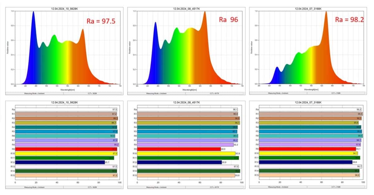 Na wykresie widać, że najszersze pasmo pokrywają kolory LIME oraz AMBER, zapewniając bardzo dobre parametry emitowanego światła. Standardowe barwy RGB służą tu do światła efektowego (kolorowego) lub do precyzyjnej kalibracji żądanej barwy — poprzez subtelne dodanie lub odjęcie danego koloru. Wynik pomiaru CRI dla tego urządzenia to aż 94 Ra, co jednoznacznie pokazuje, jak zastosowanie diod AMBER, LIME i CYAN przekłada się na jakość odwzorowania barw. Warto zaznaczyć, że wartość 94 Ra została zmierzona przy temperaturze barwowej 2700 K, czyli w bardzo ciepłym odcieniu — a to właśnie tam najczęściej wychodzą na jaw najsłabsze punkty technologii LED. W przypadku tego konkretnego urządzenia w całym dostępnym zakresie temperatur parametr CRI waha się w przedziale 94–97 Ra. To czyni światło opraw teatralnych Brightera praktycznie nierozróżnialnym od oświetlenia żarowego, a jednocześnie daje realizatorowi pełną wolność w doborze koloru.