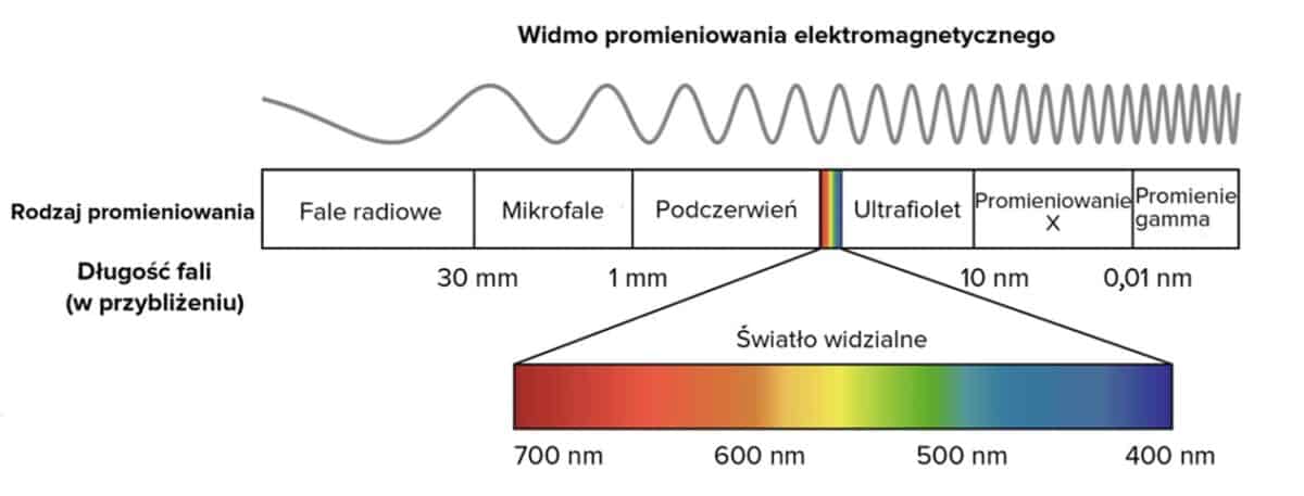 Na rysunku 1 widać, że światło widzialne to bardzo wąski zakres długości fali, które nasze oko, a następnie mózg, potrafi zarejestrować i jednoznacznie zinterpretować. Częstotliwości niższe niż kolor czerwony tworzą podczerwień, natomiast wyższe niż głęboki niebieski to tzw. ultrafiolet. Oba skraje pasma jesteśmy w stanie odczuć: ultrafiolet może powodować oparzenia słoneczne, przed czym chronią nas kremy z filtrem UV, natomiast promieniowanie o długości fali poniżej czerwieni odbieramy jako ciepło, na przykład zbliżając rękę do rozżarzonego węgla. Dla, być może, łatwiejszego zrozumienia korelacji koloru z długością fali możemy wyobrazić sobie, że kolor czerwony to „basy”, a niebieski to „soprany”. Przyjrzyjmy się teraz dwóm wykresom przedstawiającym światło słoneczne oraz tradycyjne światło żarowe.