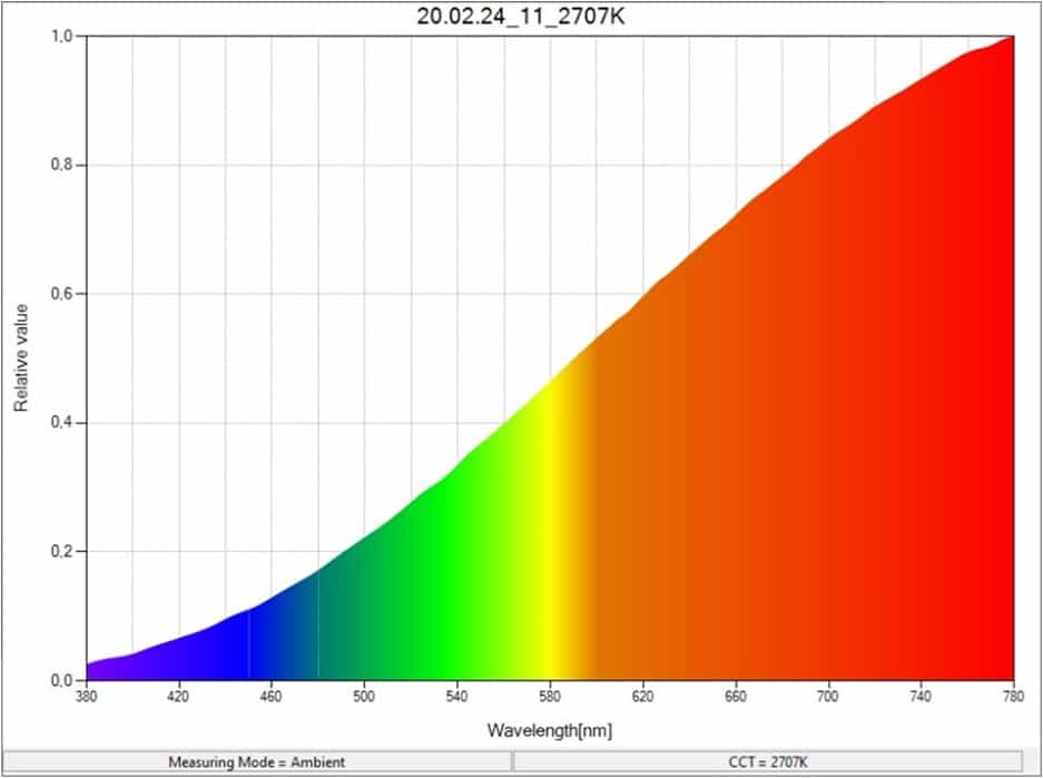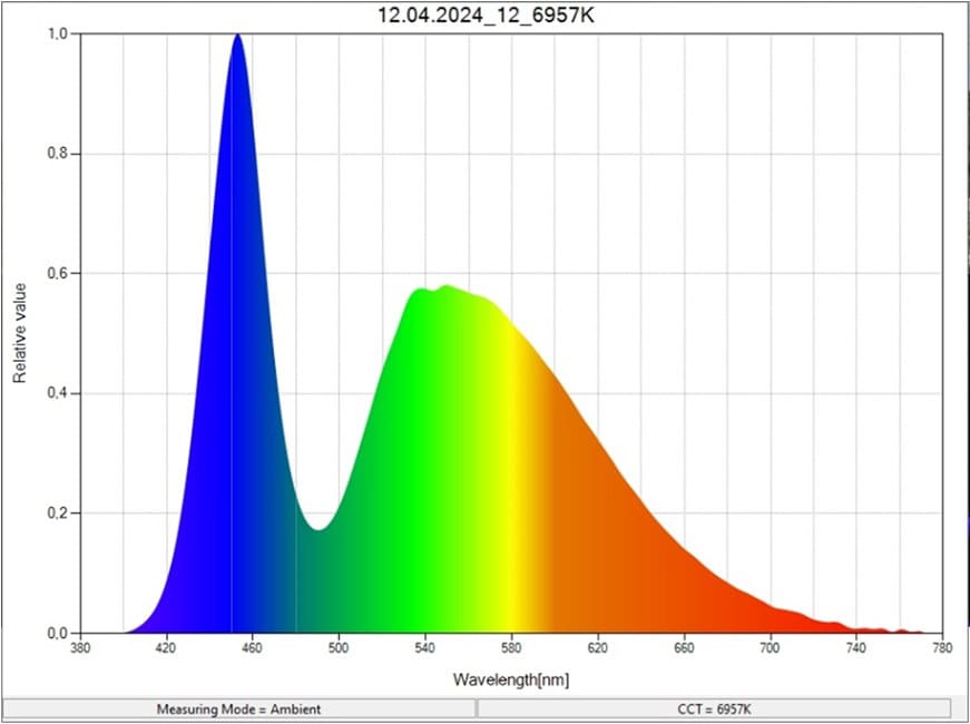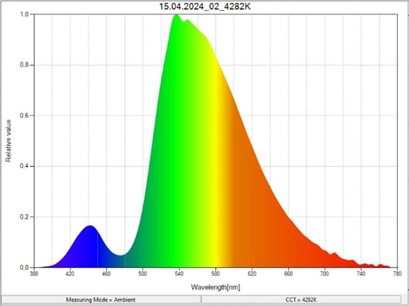Zapewniam Was, że efekt jest znacznie lepszy niż w przypadku RGBW, ale widmo wciąż niespecjalnie przypomina to znane z żarówki czy światła słonecznego. Analizując wykres, możemy dostrzec dwie „dziury”, czyli obszary, w których ewidentnie brakuje natężenia fal elektromagnetycznych. Pierwszy taki obszar znajduje się między niebieskim a zielonym, drugi — między zielonym a czerwonym. Mimo że pierwsza luka jest większa, to obszar między zielonym a czerwonym jest dla odbioru światła ważniejszy.