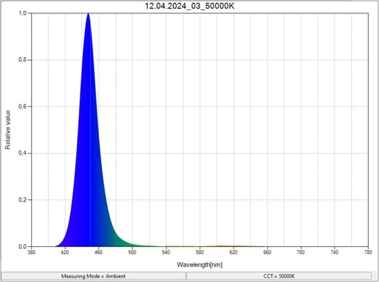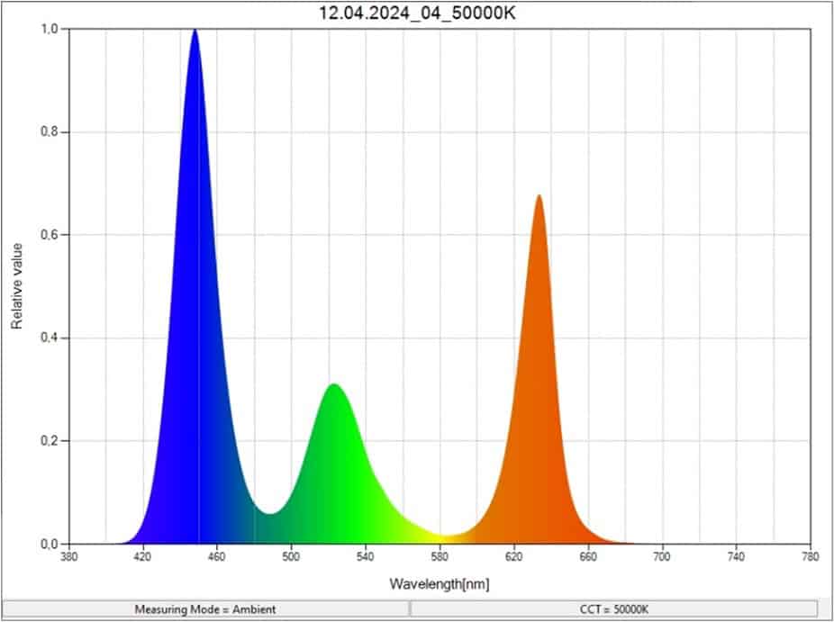 Pierwsza obserwacja to zbyt duża ilość światła niebieskiego względem pozostałych. Przyjmijmy zatem, że chcemy uzyskać biel w okolicach 5000 K i na tej podstawie skorygujmy natężenie światła niebieskiego (wykres 5). W tym wypadku światło jest już mierzalne (dla R255 G255 B255 wykraczało poza zakres miernika), natomiast zmierzone parametry okazują się dramatycznie złe. Współczynnik Ra wynosi 25/100 przy temperaturze barwowej 4400 K.