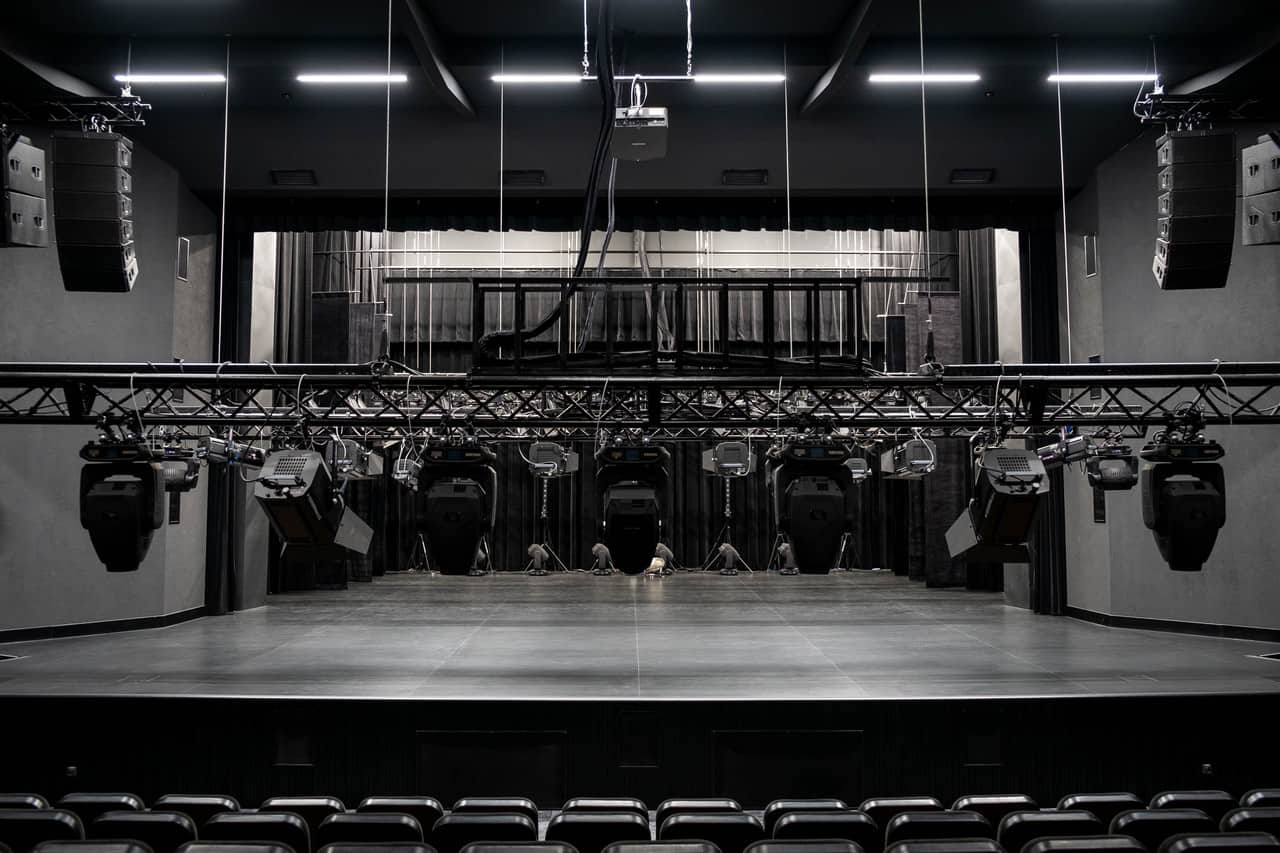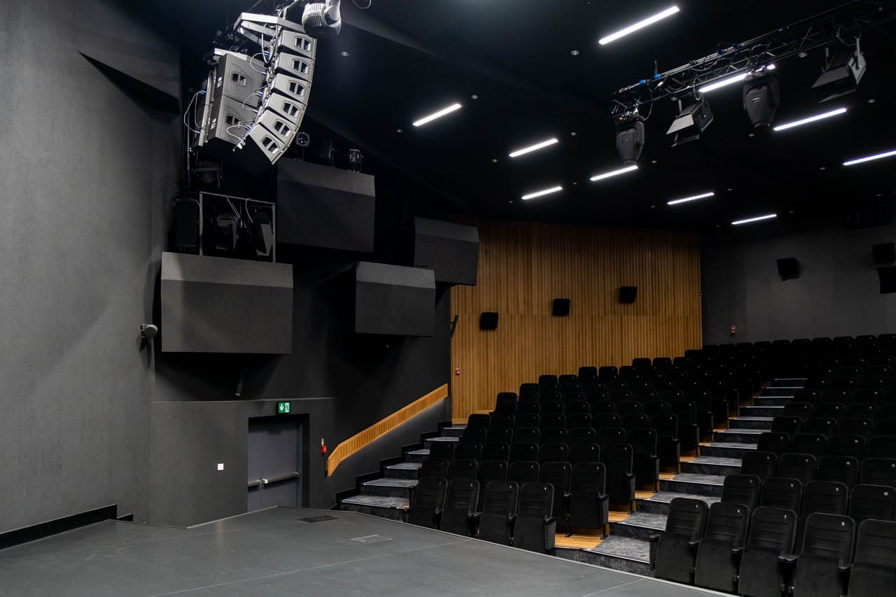 W sali widowiskowo-kinowej, mogącej pomieścić 399 widzów, zainstalowano system nagłośnieniowy marki d&b audiotechnik serii Y. Każde grono składa się z sześciu zestawów szerokopasmowych Y8 i Y12 oraz 2 modułów basowych Y-SUB na stronę. Uzupełnienie systemu stanowią zabudowane w scenie zestawy niskotonowe B22. Nagłośnienie sceny zapewniają side-fille oparte na modelu d&b Y7P oraz popularnych monitorach MAX2. W ramach wszechstronnego wyposażenia do sali dostarczono komplet mikrofonów i system mikrofonów bezprzewodowych Shure, zapewniający wielokanałową bezprzewodową transmisję audio w wysokiej jakości. Całość kontrolowana jest z poziomu konsolet mikserskich Allen & Heath dLive. Zarówno na stanowisku FOH, jak i MON znajdują się modele dLive S5000, podłączone do mixracka DM32, współdzieląc jego zasoby. System ma szereg kart rozszerzeń takich jak GigaAce, Dante czy Waves oraz stageboksów typu DX168 i GX4816, co umożliwia wiele różnych konfiguracji i scenariuszy w zależności od potrzeb dla danej aplikacji. Przesyłanie sygnałów z konsolety do wzmacniaczy odbywa się po protokole Dante dzięki konwerterom d&b DS10.