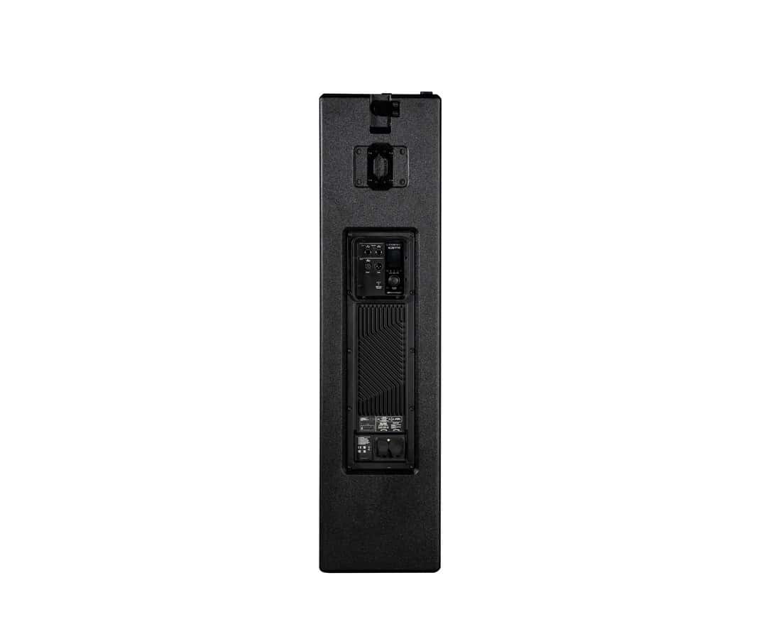 Na tylnej ścianie znajduje się wnęka, w której umieszczono wspomniany przed chwilą panel sterowania DSP oraz gniazda połączeniowe. Mamy tu zatem dwa RJ45 (wejście i wyjście) RDNet, USB-C oraz wejście i wyjście audio (w drugim wypadku jest to łącze link), w postaci gniazd XLR. Pod wyświetlaczem znajdują się także trzy diody, sygnalizujące stan urządzenia, obecność sygnału audio oraz pojawienie się wartości szczytowych. Zasilanie doprowadza się za pomocą złącz POWERCON. Przy czym w przypadku parowania kolumn można tę drugą podłączyć do wyjścia pierwszej. Omawiana kolumna charakteryzuje się naprawdę umiarkowanym poborem prądu – przy wykorzystaniu 1/8 swojej pełnej mocy i w przeciętnych warunkach użytkowania jest to 1 A (230 V AC), względnie 1,9 A (115 V AC). Przy 1/3 pełnej mocy i w warunkach intensywnego użytkowania wzrasta to do 2,2 A (230 V AC), względnie 4,4 A (115 V AC). Przy włączonym głośniku, ale bez sygnału (stan bezczynności) wartości te spadają do 0,22 A (230 V AC), albo 0,47 A (115 V AC).