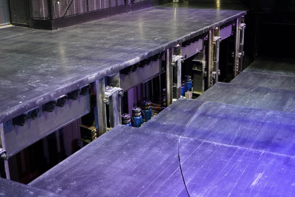 Naszą uwagę zwróciło także dziesięć prostokątów w podłodze sceny. Okazało się, że są to wyjmowane klapy – „wyjścia” spod sceny dla aktorów. Pod sceną znajduje się mobilna zapadnia osobowa, którą można podstawić pod dowolne wyjście na scenie, i która transportuje aktora z poziomu -1 zapadni na poziom sceny. Kiedy już zejdziemy pod scenę, ukazuje się naszym oczom maszynownia – ogromne silniki, przekładnie, wały i oczywiście kasety z łańcuchami SERAPID, które wprawiają w ruch zapadnie. Po bokach na podłodze stoją niebiesko-żółte wciągarki bębnowe, które napędzają sztankiety dekoracyjne i mosty oświetleniowe sceny. Pomimo ogromnej liczby urządzeń panuje tu porządek i nie ma żadnych zbędnych elementów, które mogłyby zakłócić czystość techniczną tej przestrzeni. Gdyby ktoś chciał z bliska zobaczyć te cuda techniki teatralnej, zachęcamy do śledzenia strony internetowej teatru, bowiem organizowane są wycieczki w jego niedostępne na co dzień pomieszczenia. Po dość długim pobycie w „podziemiach” udajemy się z powrotem na scenę. Sercem mechaniki jest autorski centralny system sterowania umożliwiający tworzenie dowolnych scen ruchu wszystkich urządzeń scenicznych. Za pomocą pulpitu sterowniczego operator ma pełną kontrolę nad wszystkimi urządzeniami mechaniki scenicznej. Jednocześnie mogą poruszać się sztankiety i spotykać w dole podjeżdżające do góry zapadnie. Sztankiety mogą jechać w grupach lub oddzielne z dowolnie zadaną prędkością itd.