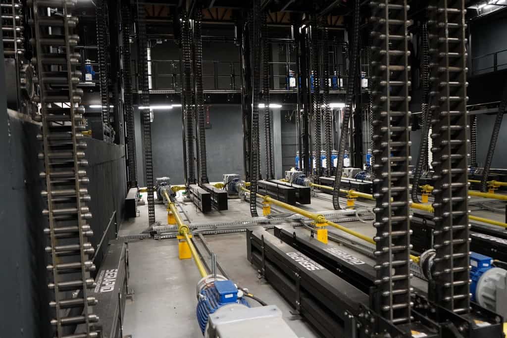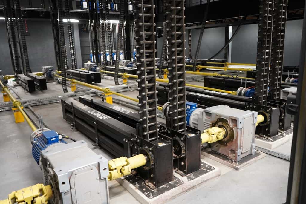 Maszynownia: ogromne silniki, przekładnie, wały i oczywiście kasety z łańcuchami SERAPID, które wprawiają w ruch zapadnie. (fot. Marcin Ziniak, Muzyka i Technologia)