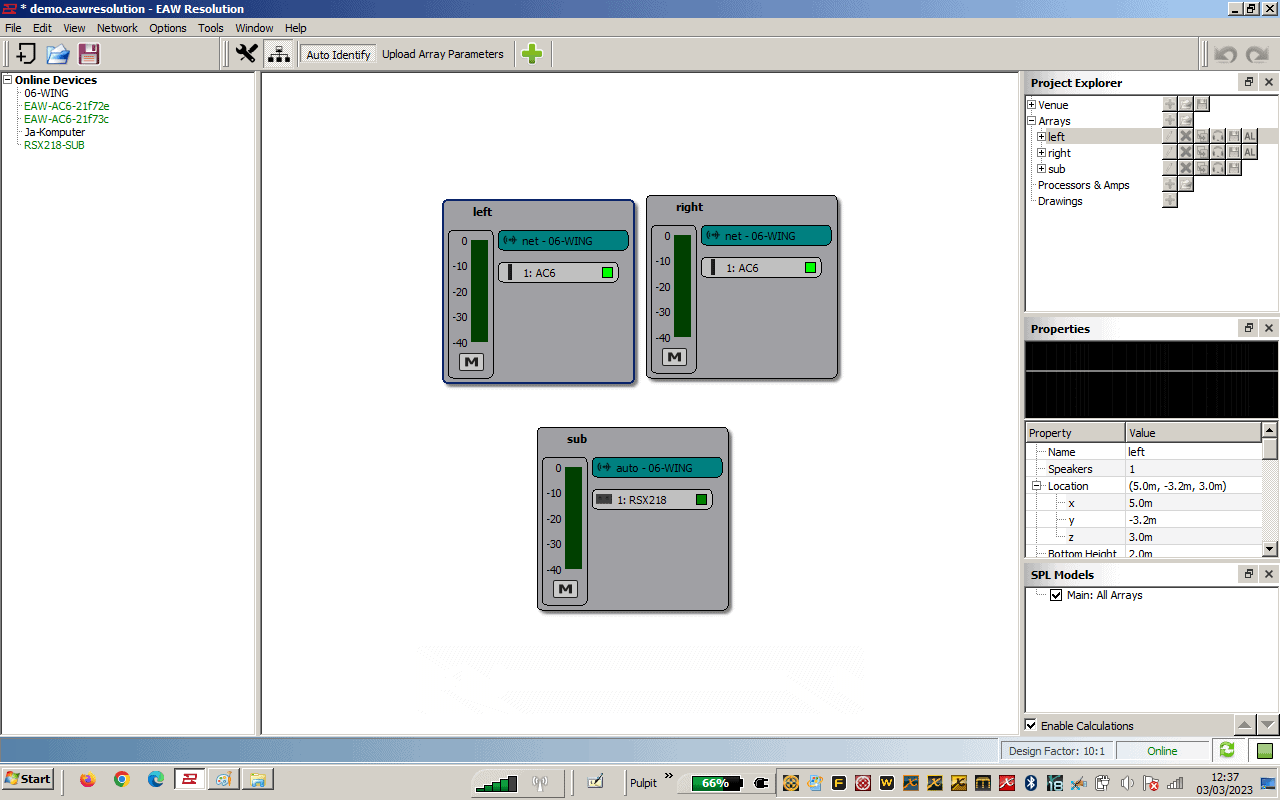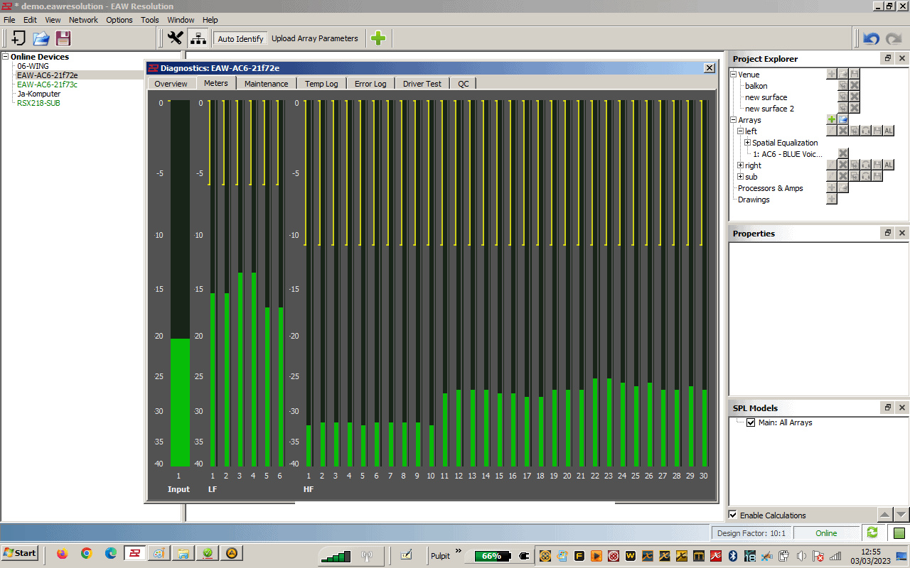 Postawienie systemu EAW AC6 jest zadaniem prostym, biorąc pod uwagę finalny efekt, maksymalnie dopasowany do warunków sali/pomieszczenia. Zestawy można postawić na statywie, lub zawiesić na specjalnych uchwytach, również w zwielokrotnionej liczbie, zapewniającej pokrycie większej przestrzeni. Zastosowanie protokołu DANTE bardzo ułatwia konfigurację i szybkie przystąpienie do pracy. Po wybraniu odpowiednich miejsc usytuowania systemu, można przystąpić do konfiguracji za pomocą programu Resolution 2. Zakładka „Network View” pozwala na upewnienie się, czy na pewno wszystkie elementy są poprawnie podłączone i otrzymują sygnał sterujący. Za pomocą bloków, w zakładce „Design View”, w prosty sposób „buduje się przestrzeń”, aby już po kilkunastu sekundach oprogramowanie mogło przesłać pakiet informacji do głośników, powodując ich ustawienie do odpowiednich pozycji. Po odpowiednim zestrojeniu L-R oraz zestawu subwooferów, otrzymujemy najbardziej optymalne pokrycie przestrzeni.