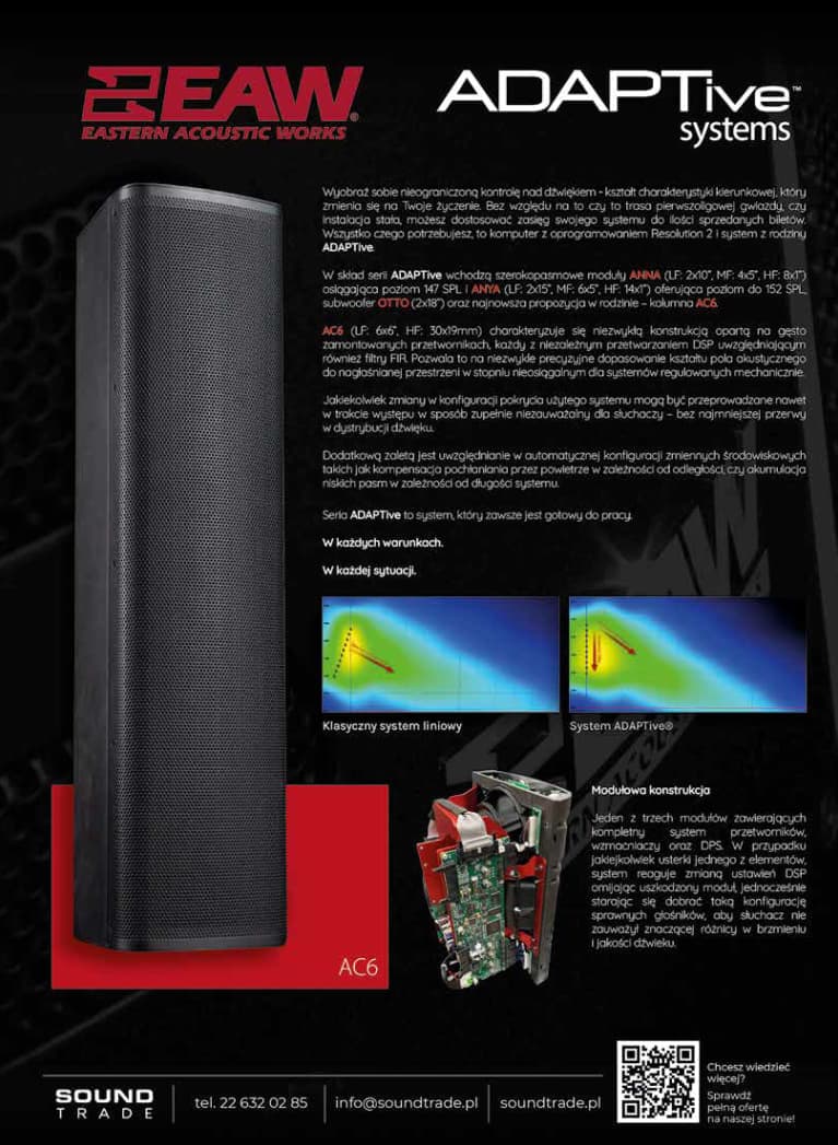 Eastern Acoustic Works wprowadziło na rynek nowy monitor sceniczny rozszerzający ofertę zestawów głośnikowych z serii Radius, która na rynku pojawiła się w połowie 2016 roku. RSX12M wyposażony został w końcówkę mocy pracującą w klasie D, działającą w trybie biamp o mocy 500 W, wyposażoną w autorskie technologie producenta Focusing and DynO dla najlepszej z możliwych odpowiedzi impulsowej przy każdym poziomie głośności. Monitor zawiera dwunastocalowy głośnik niskotonowy z dwuipółcalową cewką oraz jednocalowy driver z cewką o średnicy 1,77 cala. Głośniki ułożone zostały w konfiguracji koaksjalnej, dzięki czemu charakteryzuje się on pokryciem wynoszącym 105 × 105°. Opóźnienie systemu monitorowego opartego na prezentowanym modelu cechuje się niewiarygodnie niską latencją – wynosi ona zaledwie 2,6 ms, co czyni nowy monitor idealnym rozwiązaniem do monitorowania wokalu na scenie przez artystów.Charakterystyka częstotliwościowa RSX12M mieści się w zakresie od 55 Hz do 18 kHz, a szczytowy SPL to 128 dB. Monitor oferuje zarówno analogowe, jak i cyfrowe wejście Dante na XLR, a także wejście loop-thru, również zrealizowane na złączu XLR.Wraz z premierą Radius RSX12M producent uaktualnił darmową aplikację EAWMosaic, w której pojawiły się opcje konfiguracji nowego monitora scenicznego z poziomu tabletu iPad.