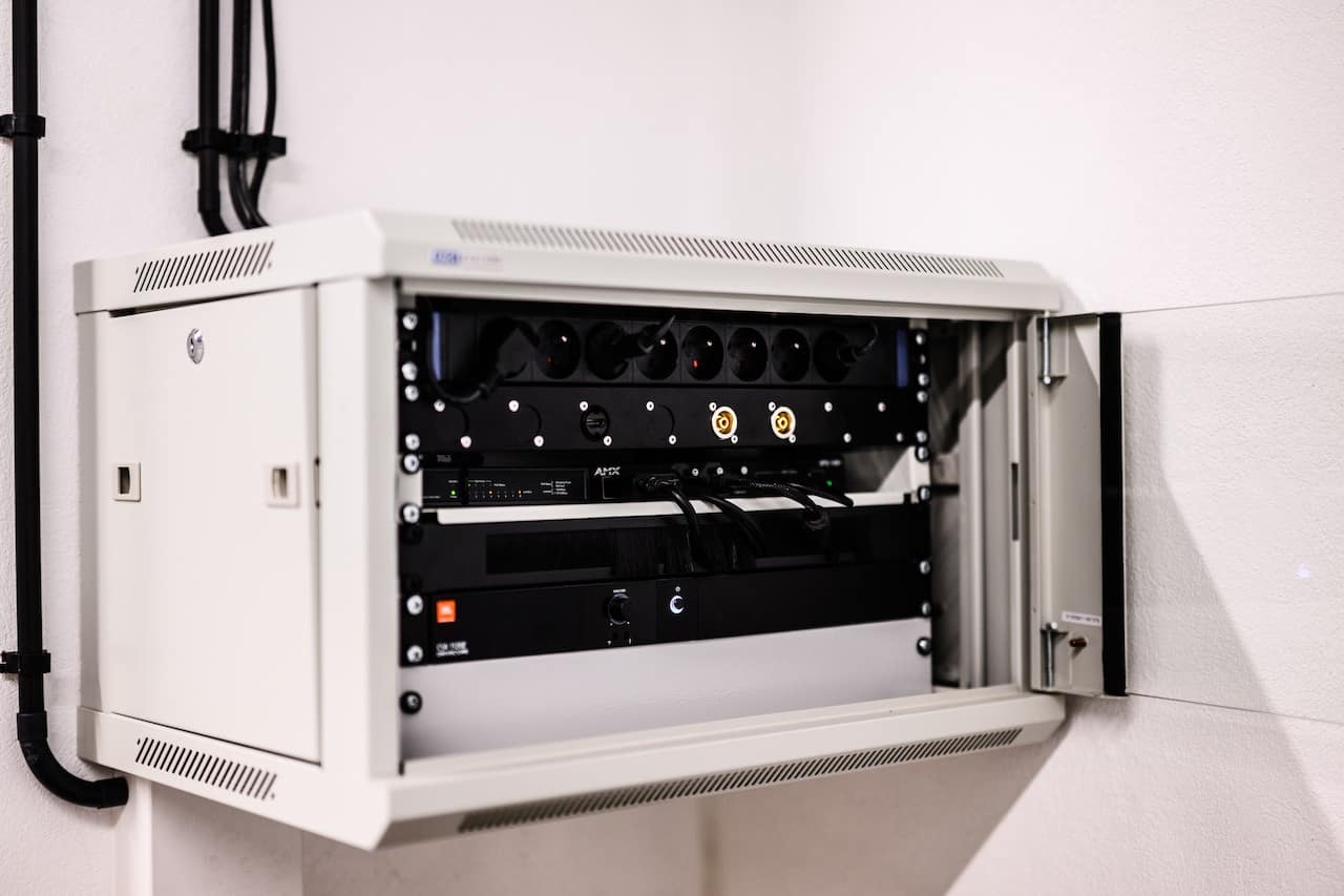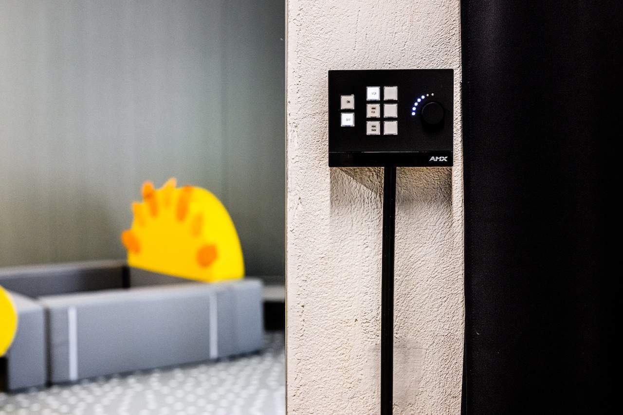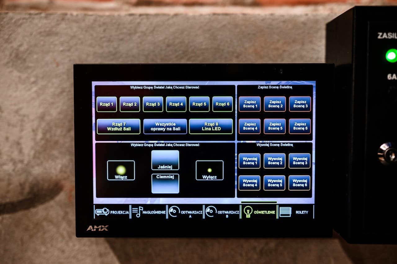 Wszystkie te urządzenia są centralnie sterowane za pomocą matrycy AMX DVX wraz z niezbędnymi transmiterami sygnałów AV. Do dyspozycji w sali są jeszcze systemy komunikacji Listen Technologies oraz mikrofony bezprzewodowe AKG. Obiekt posiada jeszcze salę konferencyjną, która oferuje elektrycznie rozwijany ekran oraz projektor i nagłośnienie JBL Control Contractor sterowane centralnie za pomocą klawiatury z procesorem AMX MCP. Dwie małe sale zajęć zainstalowane mają ścienne instalacyjne zestawy JBL Control z regulatorami AMX.