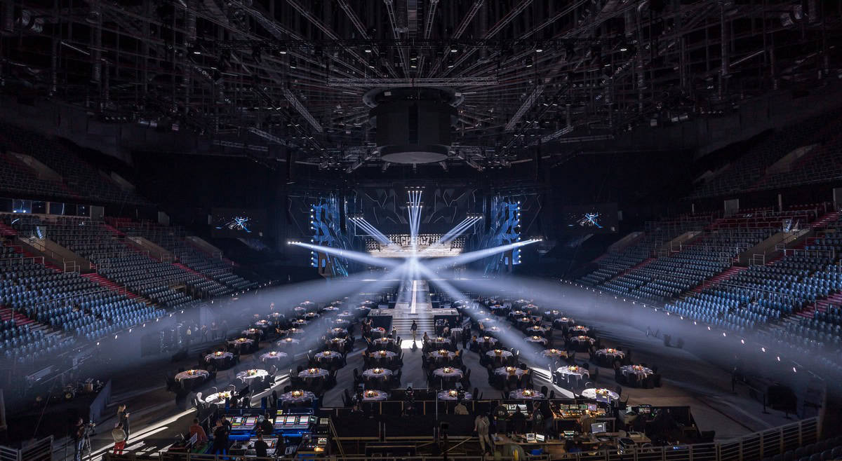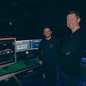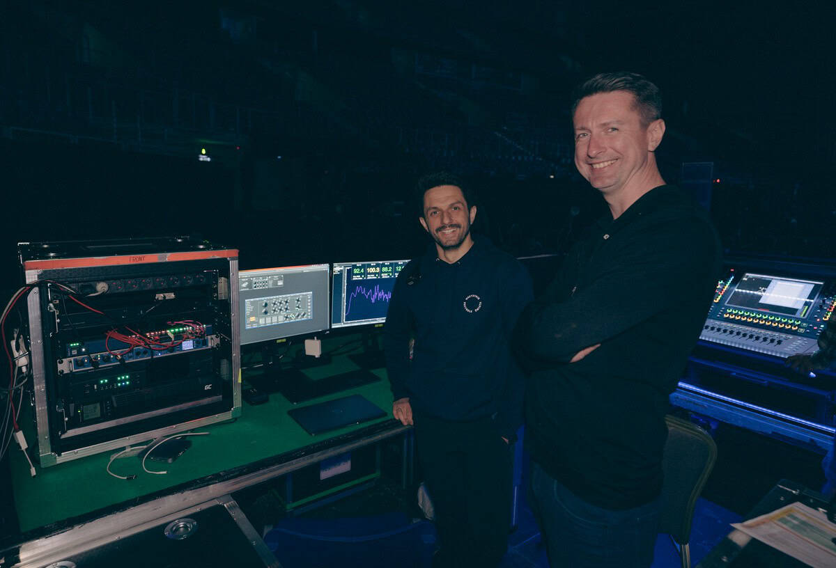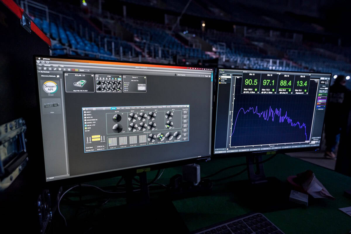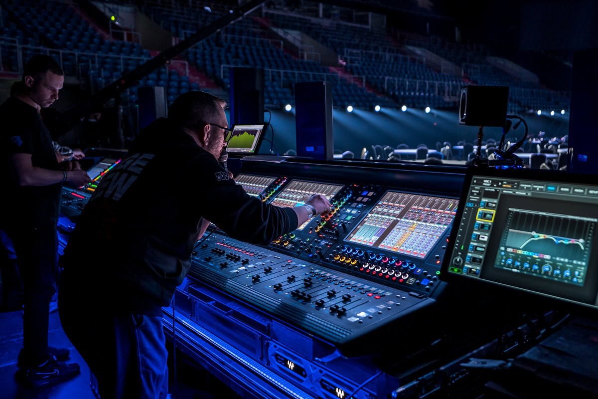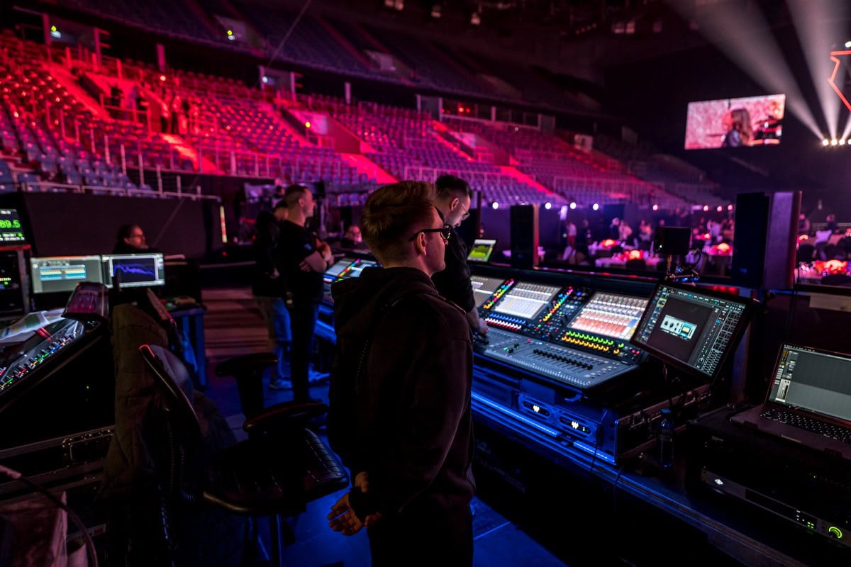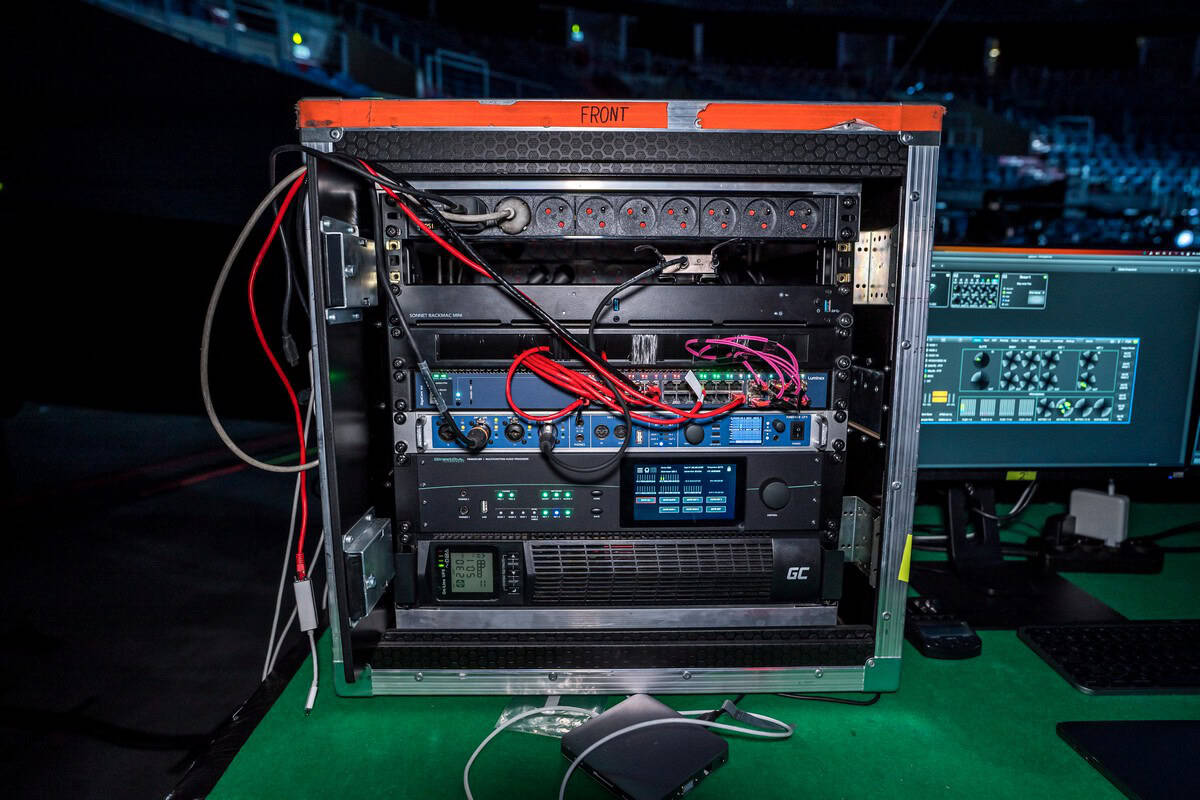 Na każdej stronie znajdowało się po 12 modułów, przy czym najniższy z nich był na wysokości 12 metrów (z kolei najwyższy sięgał aż 20 metrów). Uzyskanie optymalnego pokrycia nie było zadaniem łatwym, właśnie ze względu na konieczność uwzględnienia wymagań scenograficznych – dość długo trwały różne rozważania i przymiarki jak to zrobić, ale trzeba przyznać, że efekt był imponujący. Cały system został podpięty pod Milan, do przetwarzania wykorzystano 9 procesorów Meyer Sound Galaxy, odpowiadających za poszczególne grona – praktycznie każde otrzymało swój własny, jedynie subwoofery i frontfille mają wspólny. Kolejnym zagadnieniem, z którym musiała się zmierzyć ekipa Brawlers było stworzenie odpowiednich warunków pracy na stanowisku FOH, które przecież zwykle znajduje się na środku sali, a tutaj musiało trafić na jej koniec – co jest już sporym wyzwaniem. W tym miejscu pojawiają się już odbicia z trybun, może dochodzić do skumulowania się pewnych pasm (jak te dolne ze środka), z jednoczesnym stłumieniem góry. Realizatorzy FOH muszą mieć absolutnie referencyjne warunki odsłuchu, muszą wiedzieć jak całe wydarzenie słyszy publiczność, by zastosować najlepsze z możliwych ustawienia, a w razie potrzeby móc reagować. Konieczne były zatem liczne pomiary, próby itd. A warto dodać coś, co nie dla każdego jest oczywiste – zapełnienie hali przez publiczność, zwłaszcza zaś tak liczną, zmienia jej akustykę. A przecież nie da się przeprowadzić prób z pełną halą. Na szczęście kierowany przez Remigiusza Kasztelnika zespół to wysokiej klasy specjaliści, którzy doskonale potrafią sobie radzić nawet z najbardziej wymagającymi zadaniami. I tak też było w omawianym wypadku.