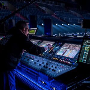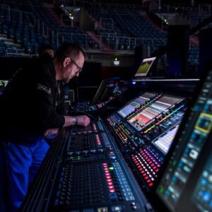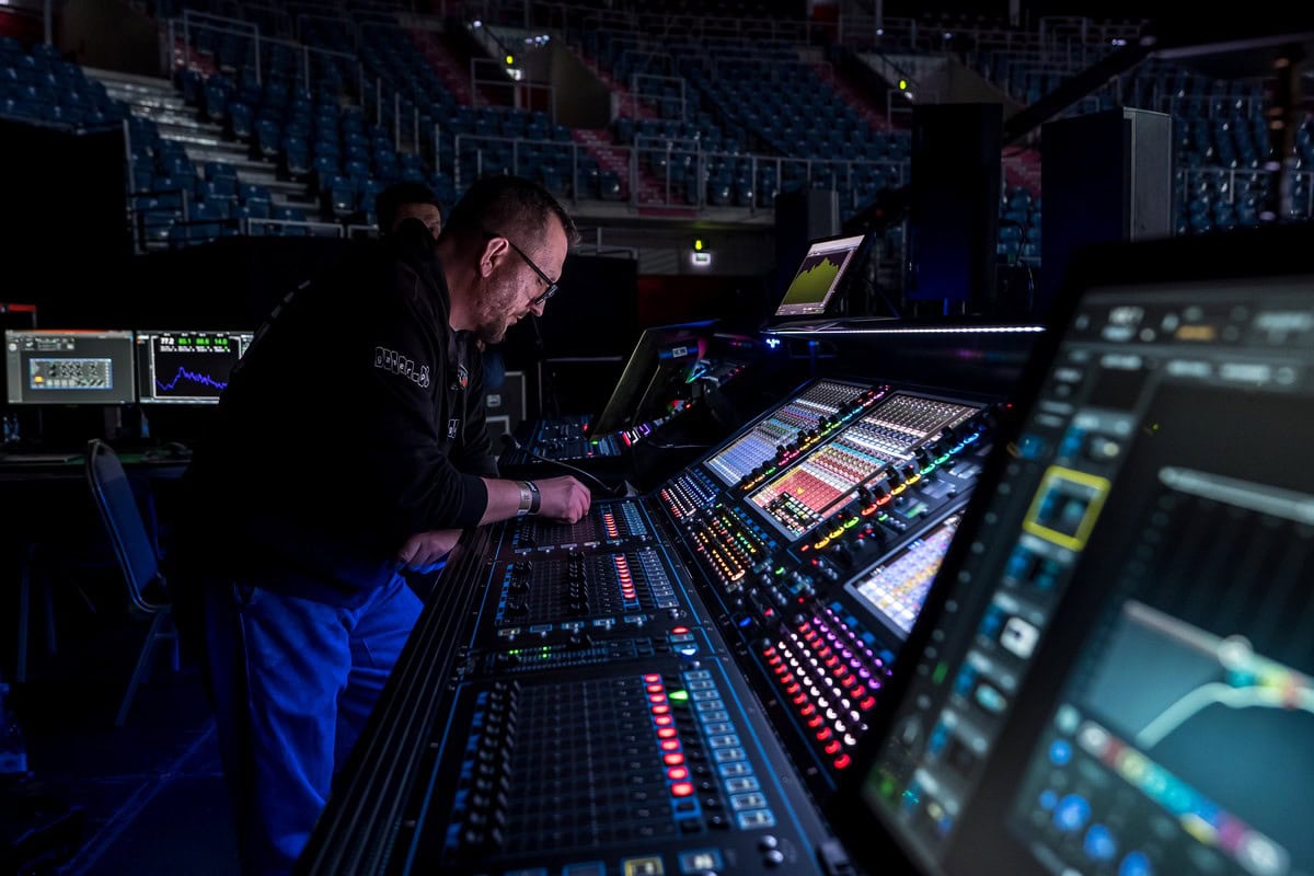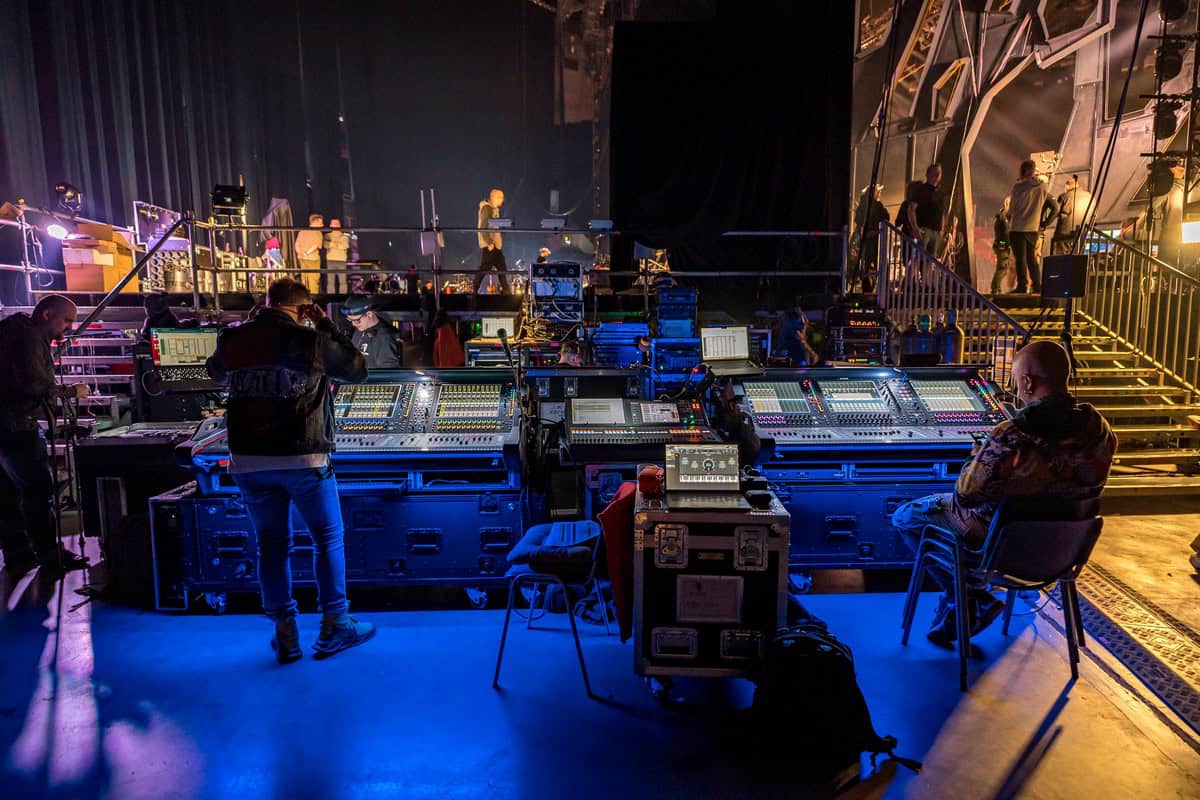 Konsolety DiGiCo Quantum 338 na stanowisku monitorowym.