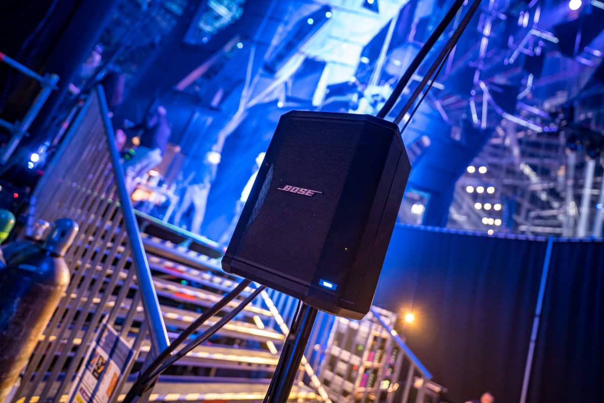 Warto przy tej okazji wspomnieć o kolejnym, bardzo ważnym narzędziu, które zostało wykorzystane podczas Fryderyków 2025, a mianowicie o procesorze DirectOut PRODIGY.MP, zaprojektowanym z myślą o koncertach, transmisjach telewizyjnych, radiowych itp. Optymalizowanym do pracy scenicznej, w studiu, czy wozie transmisyjnym. Procesor ma budowę modułową, a licencję można dobrać pod kątem konkretnych zadań. Oferuje zatem praktycznie dowolną konfigurację modułów wejść i wyjść audio, dwa sloty sieciowe, czy też funkcje DSP, SRC. Jest to tak zaawansowane narzędzie, że z powodzeniem może zastąpić w roli głównego procesora kilka innych urządzeń i samodzielnie wykonać wszystkie zadania. Meyer Sound Galaxy spełnia w tym wypadku rolę dystrybutora sygnałów podzielonych na konkretne sekcje i głośniki, zaś PRODIGY odpowiada z główne matrycowanie systemu, DSP, czy też wszystkie opóźnienia. Kamil Zajdel bardzo ceni sobie funkcjonalność tego urządzenia, z którym pracuje od paru lat, praktycznie od chwili gdy pojawiło się ono na rynku. Zaletą jest oczywiście karta Milan SRC, pozwalająca na bezpośrednie wysłanie skonwertowanego sygnału do Galaxy i wszystko dzieje się tu w domenie cyfrowej – a to także bardzo ważne. Za sceną znalazły się odsłuchy, ze zleceniami z wozu transmisyjnego – tutaj wykorzystano m. in. głośniki Bose S1 Pro.