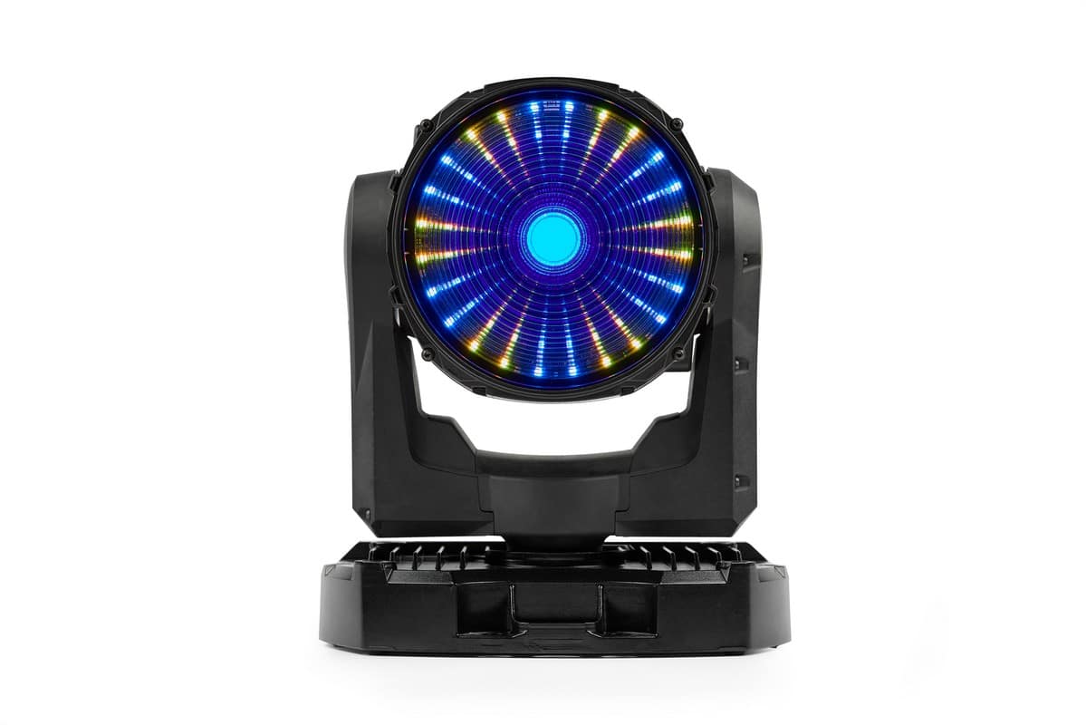 Żeby była jasność, zoom jest płynny w zakresie 4-27˚, lecz celowo podkreśliłem 2 skrajności, ponieważ przy każdej z nich głowica zachowuje się inaczej. Często hybryda WashBeam jest albo nieudanym washem, albo szerokim beamem, co jest oksymoronem. W tym przypadku mamy bardzo ładną plamę z washa, którą starałem się opisać wyżej, oraz wąskiego, mocnego beama, nadającego się na naprawdę duże produkcje. Myślę, że to zasługa zastosowanej w tej konstrukcji soczewki fresnela. Czemu użyłem stwierdzenia, że to uczciwy beam? Dzięki zgrabnym wymiarom i lekkiej konstrukcji – bardzo szybki, dzięki czemu można tworzyć spektakularne efekty nie martwiąc się, że głowica za nami „nie nadąży” i mówię tu nie tylko o ruchu, lecz także o zmotoryzowanej optyce i prędkości efektów zoom. W trybie beam strumień światła ze źródła RGBL osiąga 360 000 cd, więc jest naprawdę mocny. W tym miejscu należy jednak powiedzieć, że źródło te to nie jedyny element w MAC One, który generuje światło. Martin przyzwyczaił nas do tego, że cechą charakterystyczną ich produktów jest fakt obecności, oprócz głównych diod wytwarzających strumień światła, niezależnie sterowanego układu podświetlenia soczewki głowicy, jak choćby w MAC Aura. Dzięki temu jesteśmy w stanie stworzyć spektakularny efekt polegający choćby na tym, że oprawa, która emituje niebieską barwę wiązki widoczną w dymie, na pierwszy rzut oka świeci na czerwono, bo właśnie takim kolorem podświetlona jest soczewka. W przypadku MAC One za pomocą 24 diod RGB wyeksponowano soczewkę fresnela, dodając do funkcjonalności beama także Eye-Candy. Oczywiście, efekt ten można mapować i każdą z 24 diod traktować, jak niezależny pixel RGB. Efekt ten wygląda zjawiskowo i potęguje się, gdy urządzeń na scenie jest kilkadziesiąt.