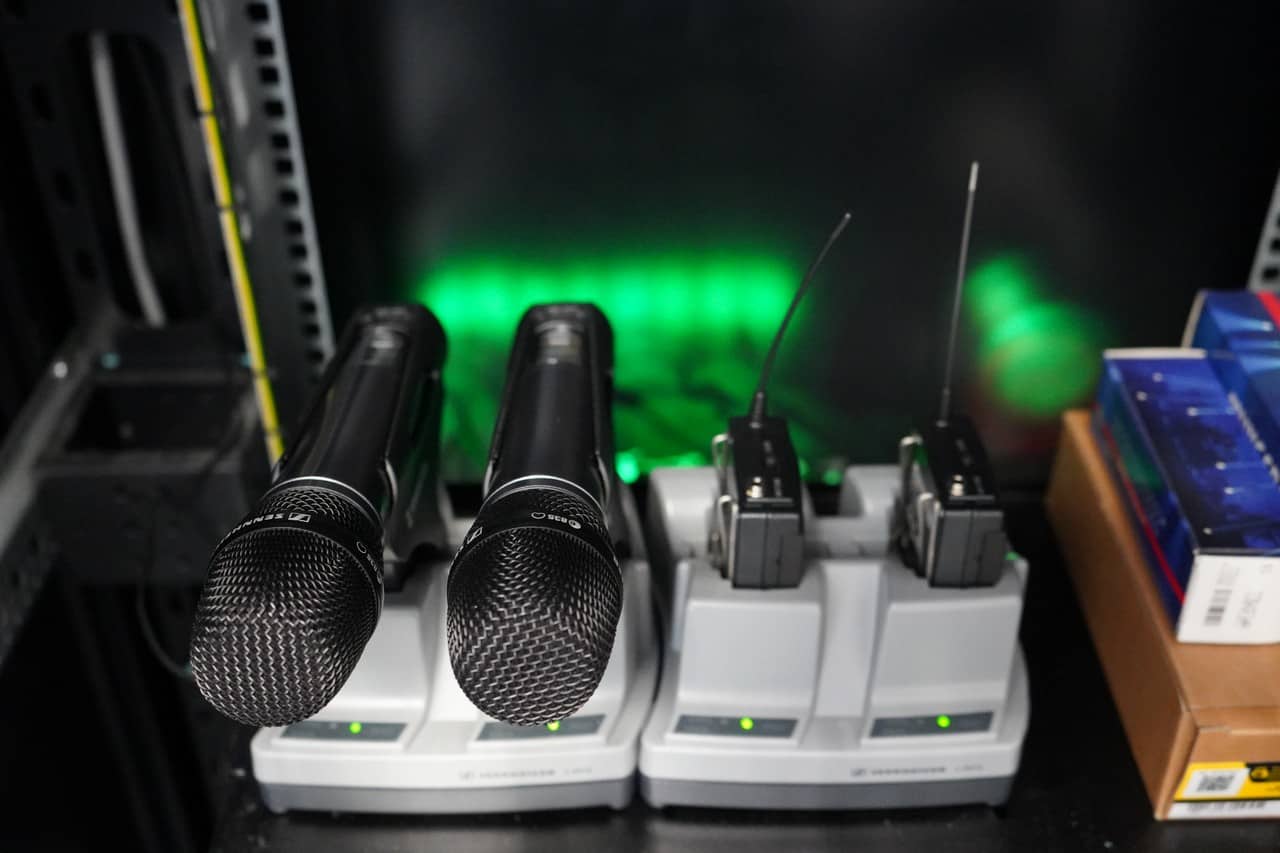 Uzupełnieniem całości są bezprzewodowe systemy mikrofonowe marki Sennheiser. Na wyposażeniu znajdują się zestawy EW 100 G4 z nadajnikiem do ręki wyposażone w dynamiczne kapsuły e835 o kardioidalnej charakterystyce kierunkowej, zestawy Sennheiser EW 100 G4 – ME4 z wytrzymałymi nadajnikami typu bodypack oraz zapewniające maksymalną swobodę ruchów mikrofony nagłowne ME 3-II. Dla zachowania pełnej elastyczności, niezależnie od typu organizowanych wydarzeń, zestaw mikrofonów obejmuje także dynamiczne mikrofony wokalowe Sennheiser e935, pojemnościowy mikrofon instrumentalny e908, dynamiczny mikrofon instrumentalny e609 oraz komplet mikrofonów perkusyjnych Sennheiser e600 (e602 II + 4 x e604 + 2 x e614).