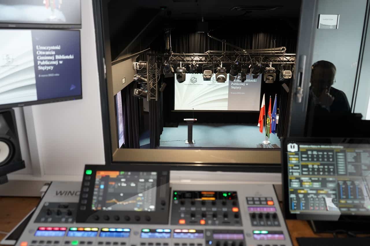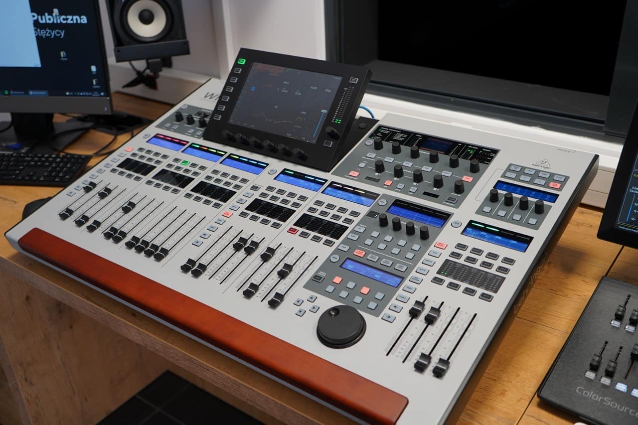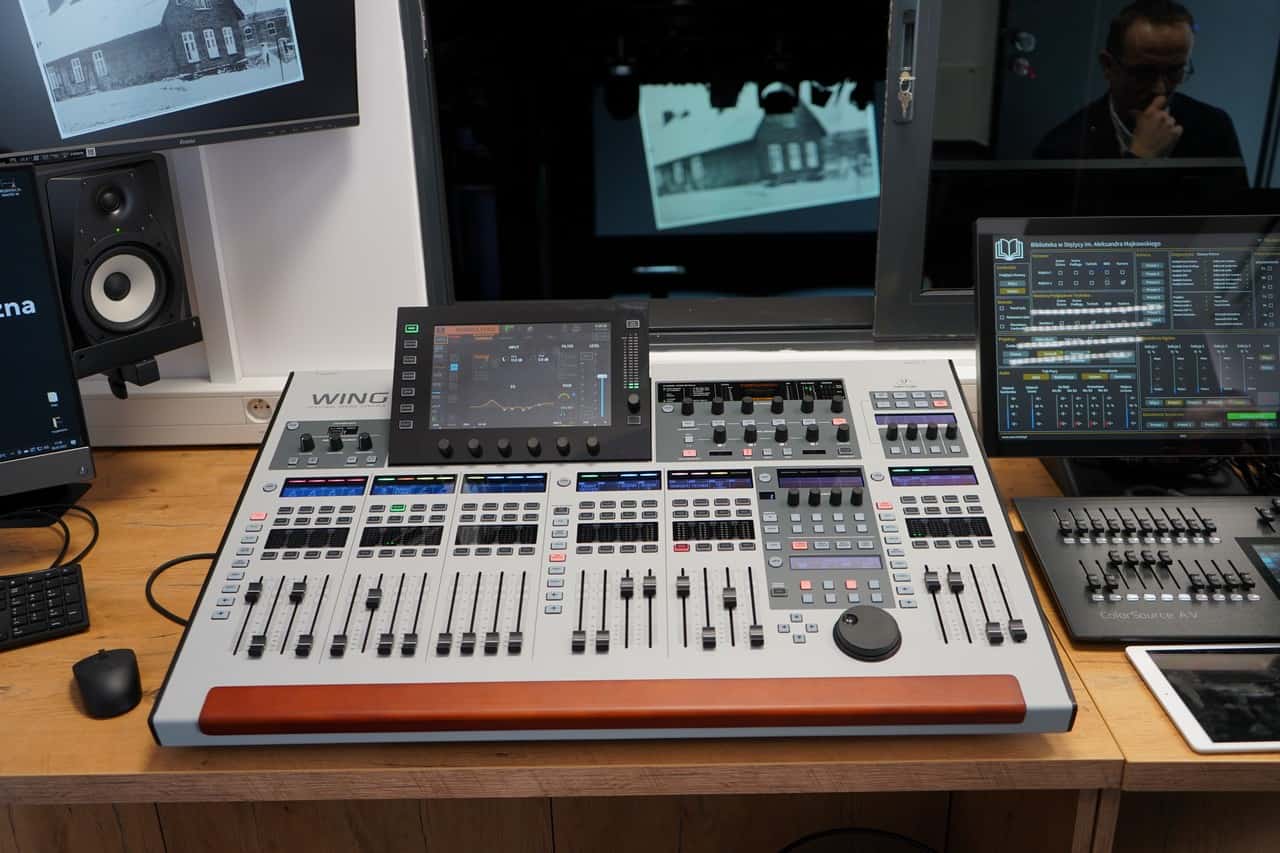 Realizatorzy pracujący w bibliotece w Stężycy mają do dyspozycji cyfrową konsoletę Behringer Wing, wyposażoną w kartę rozszerzeń Dante.