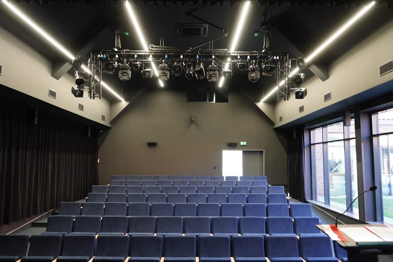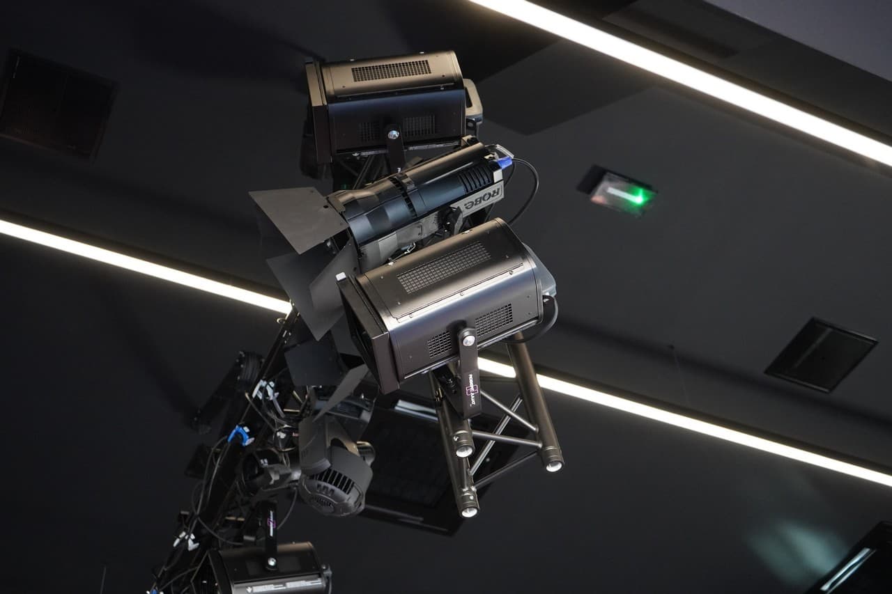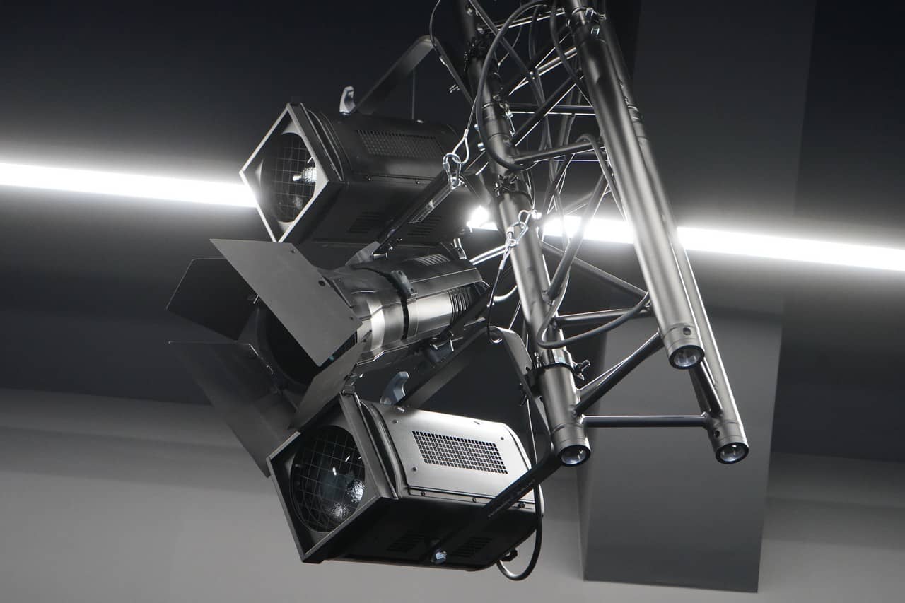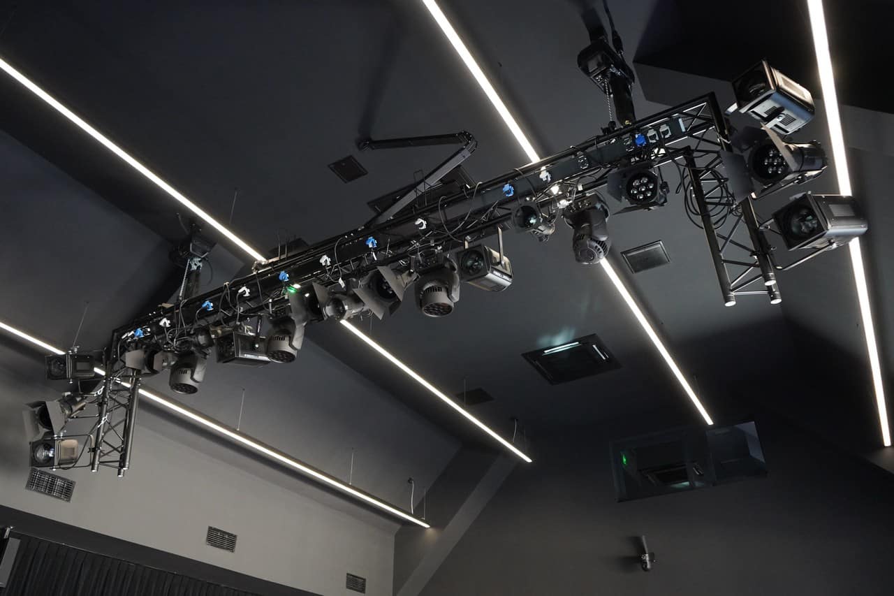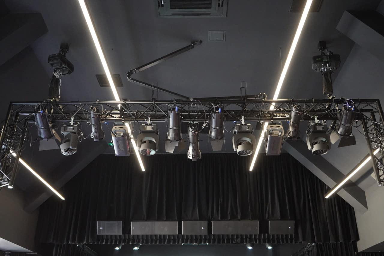 W skład parku oświetleniowego wchodzą profesjonalne urządzenia renomowanych producentów dobrane w taki sposób, aby swoją funkcjonalnością pokrywały szeroki zakres zastosowań. W sali kinowo-audytoryjnej znajdziemy 4 ruchome głowice oparte na źródle LED Claypaky Axcor Spot 300, gwarantujące bezkompromisową jakość światła i niezrównane efekty. Ponadto 4 sztuki ruchomych głów ROBE Lighting Robe LEDWash 300+, oferujące dużą uniwersalność zastosowań, w tym możliwość symulacji pracy lampy halogenowej i – co istotne do zastosowań teatralnych – cichą pracę.