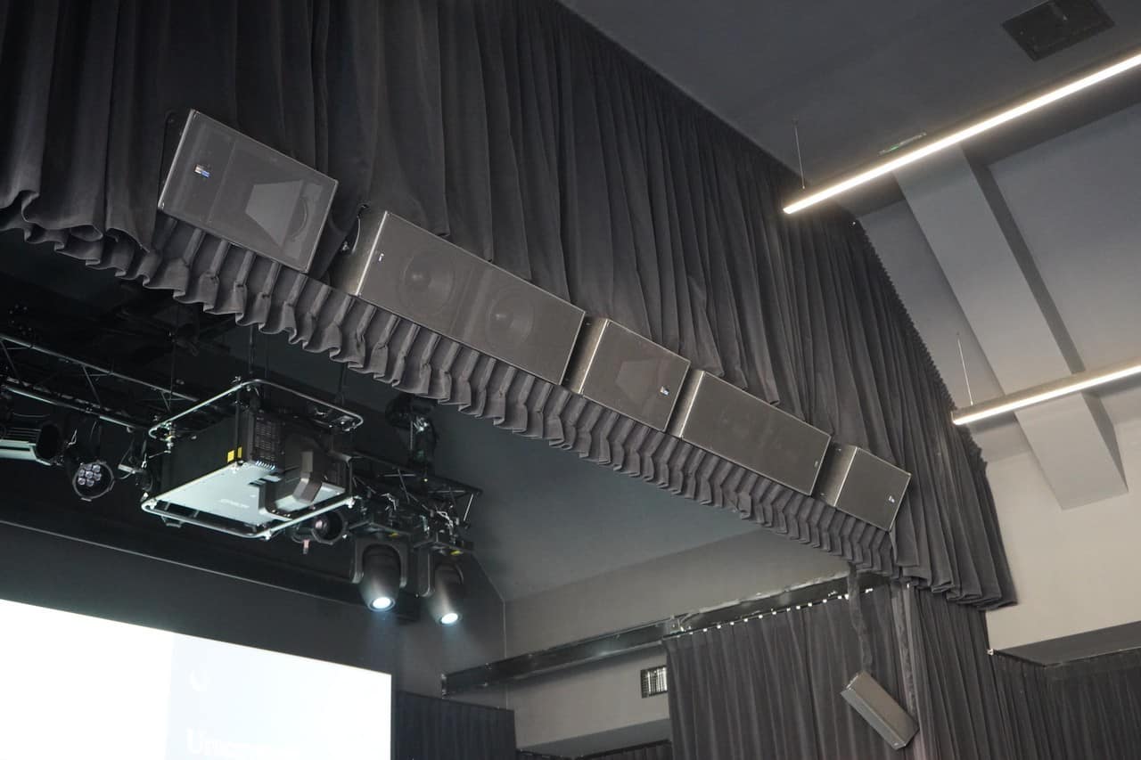 System główny sali kinowo-widowiskowej oparto o zestawy ULTRA-X40, podwieszone nad krawędzią sceny w konfiguracji LCR.