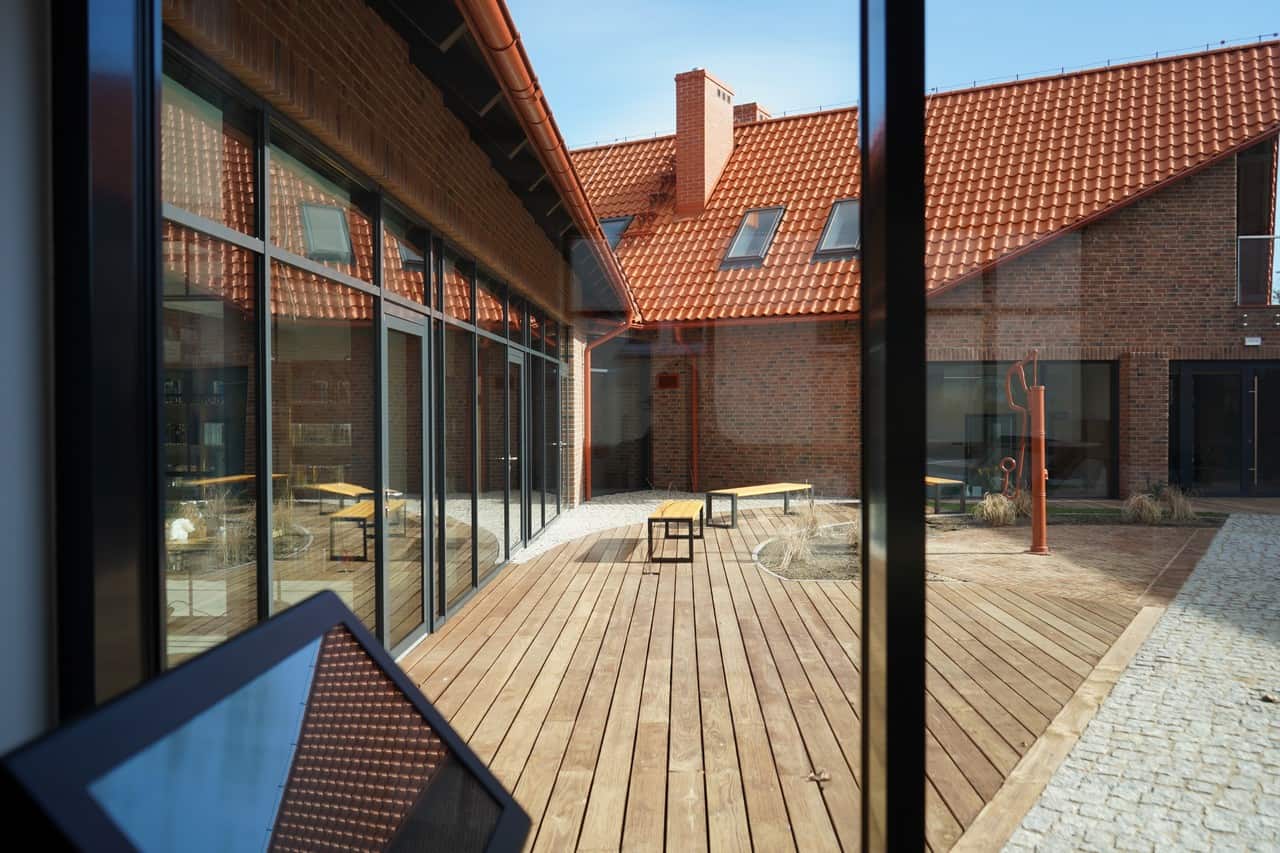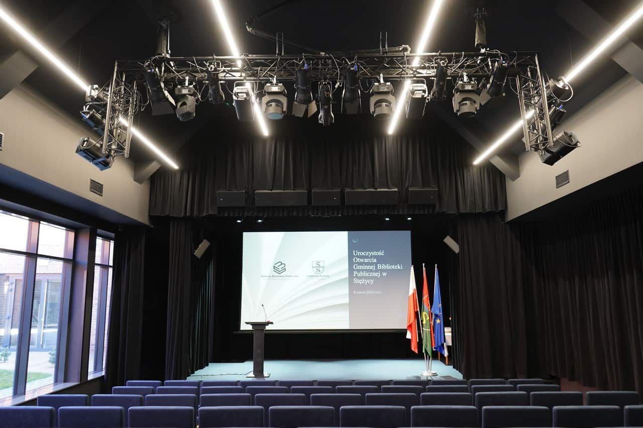 Nowa siedziba stężyckiej biblioteki mieści się w budynku zaadaptowanym po starej szkole z dobudowanymi nowymi skrzydłami. Całość prezentuje się spójnie i pomimo zachowania dawnej architektury – nowocześnie. We wnętrzach placówki znajduje się tradycyjna biblioteka, czytelnia multimedialna oraz najciekawsza przestrzeń z naszego punktu widzenia – sala kinowo-audytoryjna ze sceną, na której bezproblemowo mogą odbywać się kameralne koncerty, przedstawienia teatralne, spotkania i szereg innych wydarzeń.