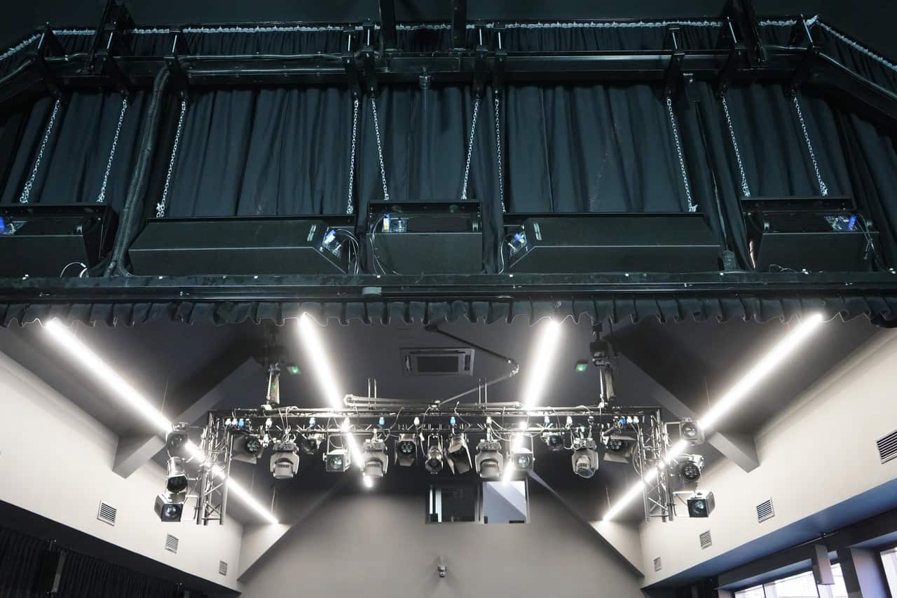 Ponadto zainstalowano 4 reflektory Robe PARFect 150 RGBW, 3 reflektory profilowe ETC Source Four Jr 25-50 Zoom i tyle samo reflektorów ETC Source Four 25-50 Zoom. W opisywanej przestrzeni znalazły się także, idealne dla tego typu obiektów pełniących wielofunkcyjną rolę, reflektory Robert Juliat Lutin 306LPB. Całość uzupełnia wytwornica dymu Look Solutions Viper NT. System oświetleniowy kontrolowany jest z poziomu sterownika ETC CS20 Colorsource ETC w wersji AV.