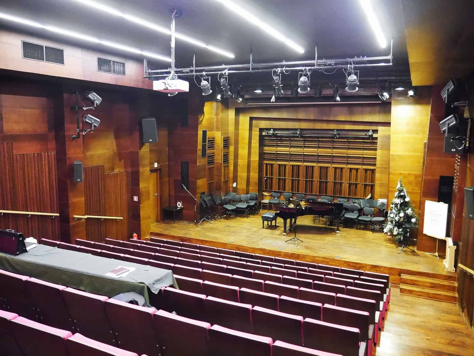 Szkoła Muzyczna I i II stopnia im. B. Rutkowskiego w Krakowie to nowoczesna i prężnie rozwijająca się placówka oświatowa. Obiekt oprócz swojej podstawowej funkcji edukacyjnej pełni również rolę gospodarza podczas licznych koncertów, festiwali oraz przeglądów muzycznych. Pod koniec 2014 roku, w ramach rewitalizacji oraz rozbudowy Szkoły Muzycznej w Krakowie, oddano do użytku nowo wybudowaną salę koncertową mogącą pomieścić 138 osób. Nagłośnienie sali koncertowejInstalacja nagłośnienia na sali koncertowej jest podzielona na cztery sekcje:Nagłośnienie frontowe składające się z dwóch kolumn Dynacord VL152 zasilanych przez dwa wzmacniacze mocy Dynacord LX2200 oraz dwóch zestawów subniskotonowych Dynacord SUB18 napędzanych wzmacniaczem Dynacord LX3000. Dogłośnienie boczne zbudowane na bazie czterech kolumn Dynacord VL262 zasilanych przez czterokanałowy wzmacniacz mocy Dynacord DSA 8405. Dogłośnienie frontfill składające się z dwóch kolumny Dynacord VL262 zasilanych wzmacniaczem mocy Dynacord LX2200 oraz system monitorowy, bazujący na czterech aktywnych monitorach podłogowych Dynacord AXM 12A. Punktem centralnym systemu jest matryca Dynacord P64, która łączy system w sieci IRIS-Net. Urządzenie wyposażono w dwie karty wejściowe MI-1 oraz dwie karty wyjściowe AO-1, dające łącznie szesnaście kanałów wejściowych i szesnaście wyjściowych. Zastosowanie matrycy P64 umożliwiło również przygotowanie specjalnych presetów, w których zastosowano zaawansowane ustawienia filtrów IIR oraz Biamp FIR. W ramach dostosowania obsługi systemu nagłośnienia do potrzeb użytkownika, na ścianie zainstalowano pulpit PWS-6 wraz z kontrolerem PWS-C. Dzięki niemu użytkownik może w prosty sposób przywołać konkretne ustawienie systemu wybierając z pośród dwóch dostępnych: koncert – działa system frontowy wraz z systemem subniskotonowym (podział trójdrożny) i dogłośnieniem frontu sceny – w tym programie zastosowano inne ustawienia poszczególnych głośników, aby wyeksponować brzmienie instrumentów oraz ułatwić stworzenie dobrze brzmiącego miksu na całej powierzchni odsłuchowej. W trybie koncert pracują również głośniki efektowe, ale ich poziom głośności jest zmieniony, poszerzając jedynie bazę stereo. konferencja – działa system frontowy bez kolumn subniskotonowych (podział dwudrożny, pełno pasmowy) oraz zestawy efektowe. Źródła sygnału System nagłośnienia może czerpać z czterech niezależnych źródeł sygnału. Głównym źródłem jest konsoleta Behringer X32, która umożliwia nagrania oraz realizację koncertów. Urządzenia jest zlokalizowane w specjalnie przygotowanym pomieszczeniu realizatora. W trakcie większych imprez konsoleta może pracować na sali koncertowej, w przypadku mniejszych wydarzeń można skorzystać z bezprzewodowego sterowania za pośrednictwem aplikacji w I-Padzie. Drugim źródłem jest mikser PreSonus 24.4.2 podłączany do specjalnego przyłącza naściennego. Urządzenie pozwala na realizację mniejszych imprez oraz prób zespołów. Niewielkie rozmiary oraz mobilność miksera sprawiły, że stał się on również częścią systemu mobilnego składającego się z aktywnej kolumny subniskotonowej Dynacord A118A oraz dwóch zestawów głośnikowych Dynacord D8A. System pozwala na realizację prób w pozostałych szkolnych salach. Trzecim źródłem jest mikser ścienny UV300, który pełni rolę prostego i intuicyjnego interfejsu. Mikser umożliwia podłączenie mikrofonu oraz liniowego źródła dźwięku. Czwartym źródłem jest przetwornik Crestron, który po podłączeniu np. laptopa wyodrębnia wizję wysyłając ją do projektora oraz sygnał audio, który jest podawany bezpośrednio do matrycy P64. Na obiekt dostarczono również komplet profesjonalnych mikrofonów Sennheiser przeznaczonych do realizacji nagrań oraz występów na żywo.