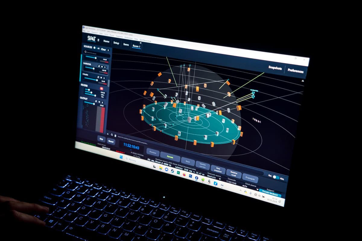 Dzisięć sygnałów audio wysyłanych z miksera matrycowego, jest pozycjonowanych w wirtualnej przestrzeni immersyjnej przy pomocy oprogramowania SPAT Revolution firmy FLUX.