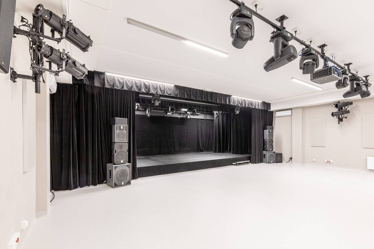 Projekcje filmowe oraz zajęcia z wykorzystaniem multimediów realizowane są przy pomocy elektrycznie rozwijanego ekranu o przekątnej 200” oraz projektora laserowego o rozdzielczości WUXGA i jasności 8000 ANSI lumenów. System dystrybucji sygnału wideo działający w rozdzielczości 4K oparto na mediakonwerterach pracujących w standardzie HDMI-HDBaseT. W sali wielofunkcyjnej znajduje się również rozbudowana instalacja zasilająca, z niezależną kontrolą załączenia każdego obwodu. Zadbano także o elastyczną sieć sterowania urządzeniami oświetleniowymi, opartą na standardach DMX i Ethernet. Specjaliści z P.S. Teatr zadbali także o instalację i przyłącza (zarówno w domenie cyfrowej, jak i analogowej) dla elementów nagłośnienia sali wielofunkcyjnej, takich jak system PA i głośniki kinowego dźwięku przestrzennego.