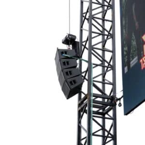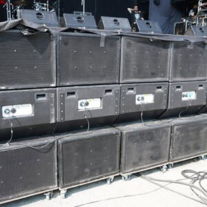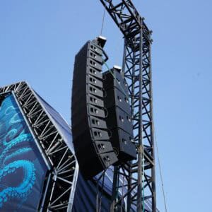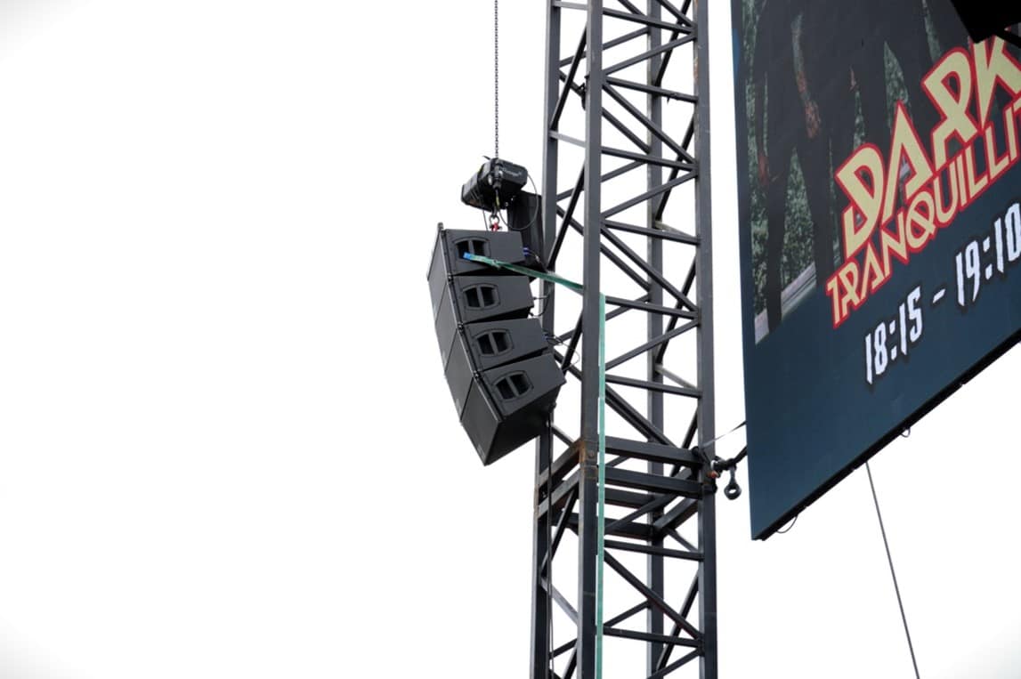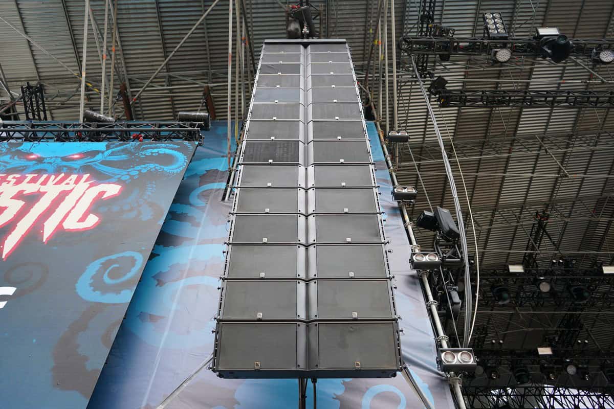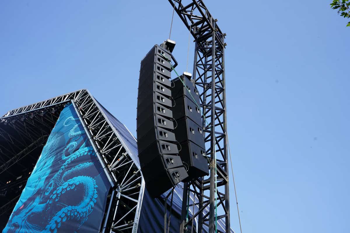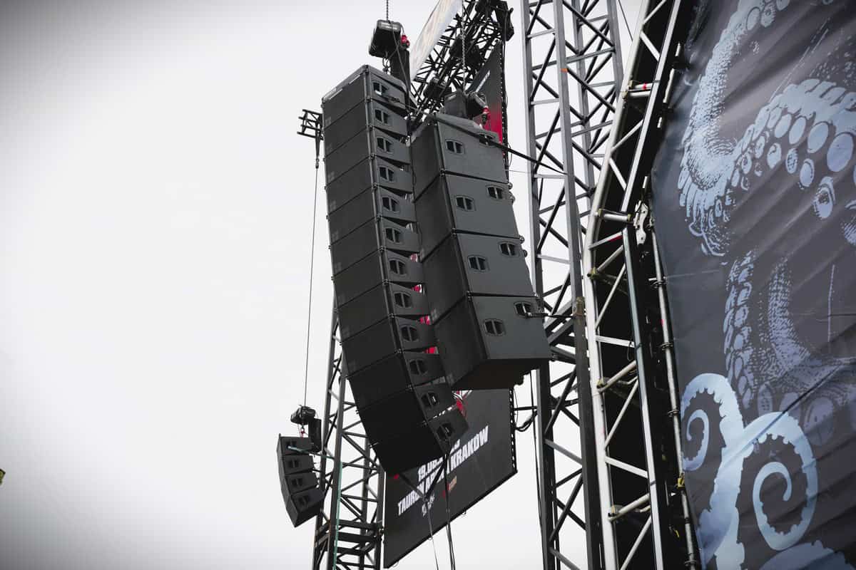 System frontowy na Park Stage tworzyły dwa grona (L+R) złożone z dziesięciu modułów V8 i dwóch modułów V12, a za nimi powieszono subwoofery V-SUB – po cztery na stronę. Za nagłośnienie odpowiadała firma Prosound. (fot. M. Ziniak)