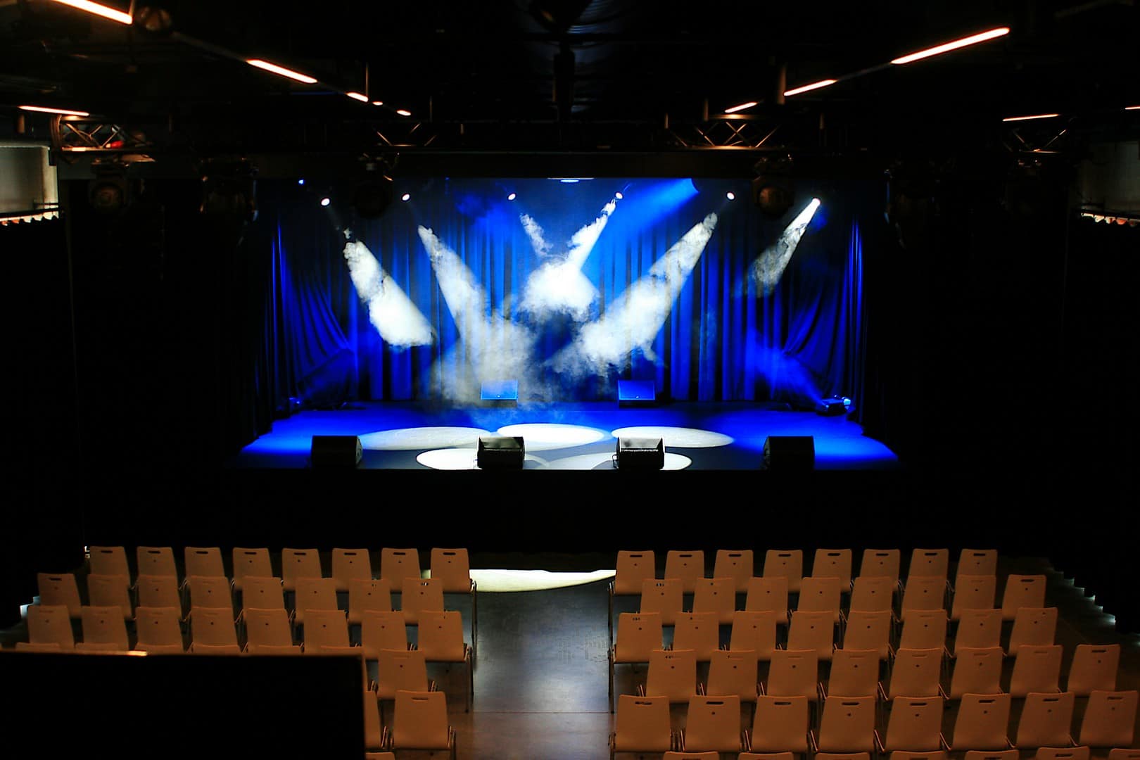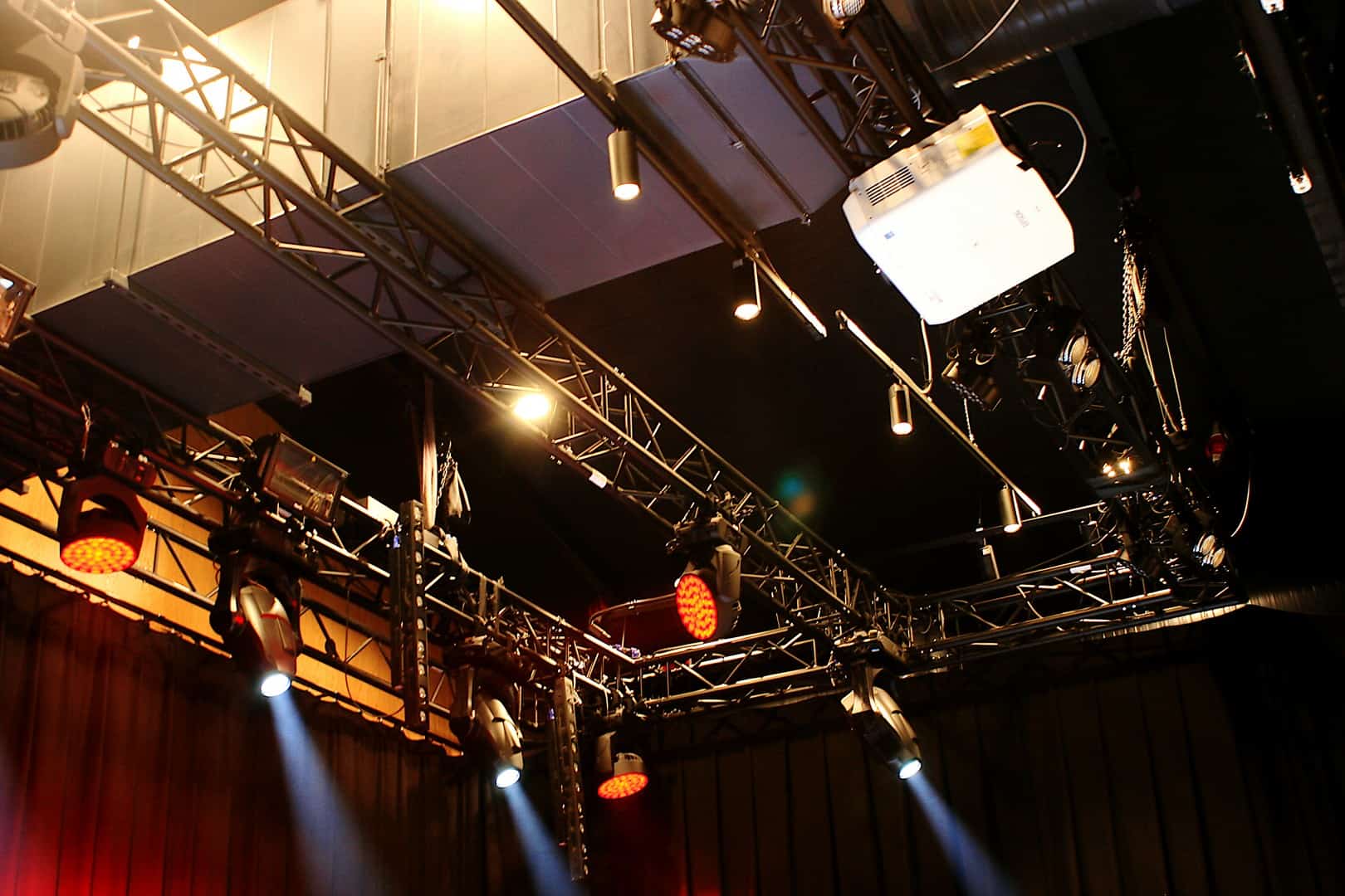 Kolejnym ważnym elementem są teatralne reflektory Briteq BT-THEATRE 250EZ, z soczewką typu fresnel, i źródłem mocy 250 W. Mają elektryczny zoom o zakresie do 10 do 50 stopni, regulowanym przez DMX, co znacznie ułatwia pracę na estradzie. Reflektory te charakteryzują się ciepłym, białym światłem o wysokim CRi, Mimo iż za chłodzenie odpowiada wentylator pracuje on bezszelestnie. Na sali znajdują się 4 reflektory, zamocowane parami do ściany. Tu warto wspomnieć, że do podwieszenia elementów oświetlenia wykorzystano haki Briteq Fast Clamp Black V2. Na sali widoczne są jeszcze takie urządzenia jak Robe LED Wash 600 (10 sztuk), Showtec Sunstrip Active MKII (8 sztuk), Showtec Stage Blinder 2 X (4 sztuki), Showtec Compact Par 7 Q4 czy splitter DMX Chauvet RDMX splitter 8. Podczas wielu imprez można dodatkowo zbudować nastrój za pomocą wytwornic mgły, zatem dwa takie urządzenia znalazły się w rogach sceny. Wydarzenie multimedialne czy projekcje filmów realizowane są na ramowym ekranie ściennym (umieszczonym za elektrycznie odsuwanymi kotarami), o szerokości 5 metrów (16:10). Projektor to laserowy Epson EB-L1100U.