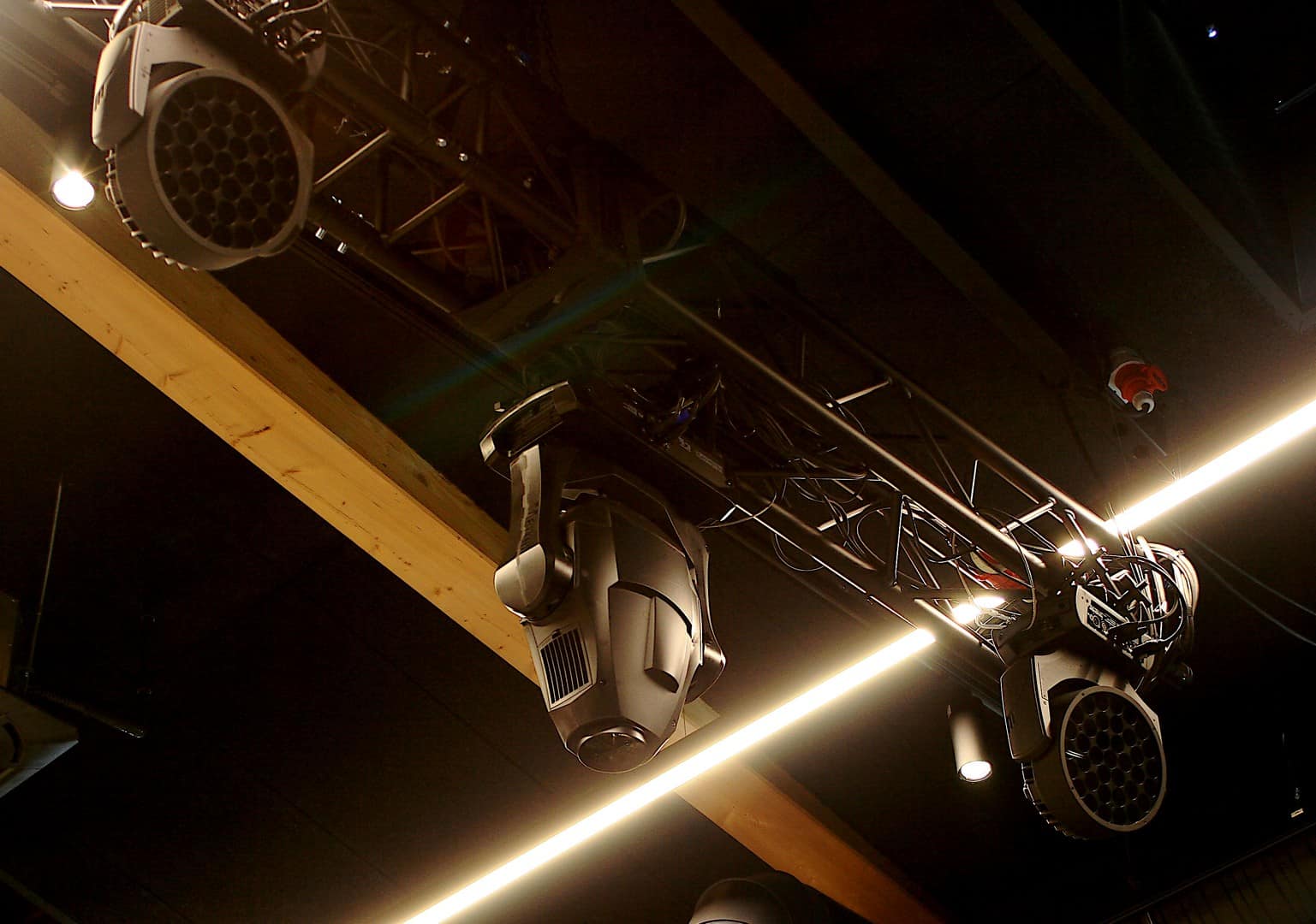Sercem instalacji oświetleniowej są popularne spoty riderowe Martin MAC Quantum Profile. Te ruchome głowy stały się niemal standardem w naszym kraju, ale też ich walory użytkowe w pełni to uzasadniają. Na sali koncertowej zainstalowano 8 takich spotów, podwieszonych na kratownicowej konstrukcji podsufitowej. Źródłem światła jest tutaj wydajna biała dioda LED (475 W), a szybki zoom (12° do 36°), zmiana kolorów CMY, ciekawe graficznie gobo i inne efekty czynią to urządzenie ciągle bardzo wydajnym i uniwersalnym. Spot ma konwekcyjne chłodzenie, połączone z bardzo cichym wentylatorem, co pozwala na kulturalną pracę na scenie. Oferuje szereg efektów świetlnych oraz pełną kontrolę (8/16-bitową). W przypadku stroboskopów także postawiono na sprawdzony model, instalując dwie sztuki Martin Atomic 3000. Moc 3000 W. Regulacja w zakresie od 0 do 100%, sterowanie czasem trwania błysku, sterowanie za pomocą DMX czy zintegrowane chłodzenie sprawiają, że jest to bardzo dobry wybór.