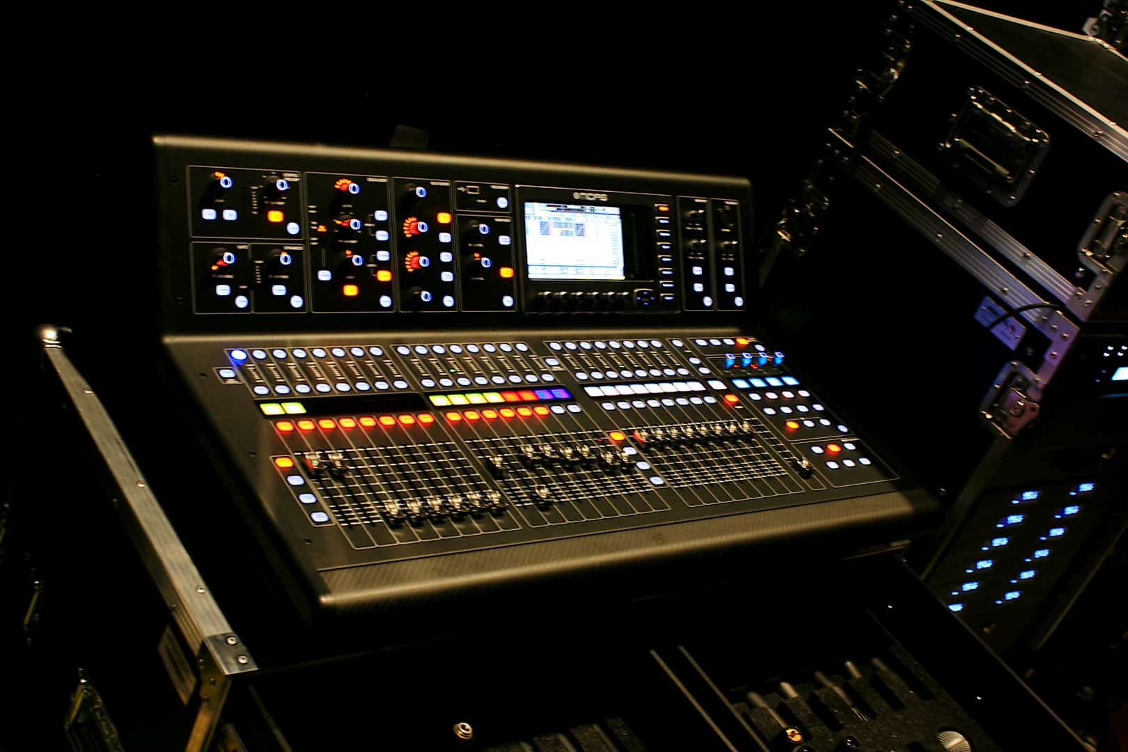 Jak już wspomniano, w roli konsolety monitorowej wykorzystywany jest znakomity cyfrowy stół Midas M32 Live, ulokowany z boku sceny, za kotarą. Oferuje 40 kanałów wejściowych, 32 wielokrotnie nagradzane przedwzmacniacze mikrofonowe Midas Pro, 25 czasowo i fazowo zgodnych szyn miksujących, 8 grup DCA i 6 grup mute, 8 stereofonicznych silników efektowych oraz zmotoryzowane suwaki. Zastosowany protokół audio AES50 pozwala na obsługę 96 wejść i wyjść. Konsoleta ma także 32 dwukierunkowe kanały do nagrywania i odtwarzania na dwóch kartach SD/SDHC, co pozwala na zapis do nieco ponad 3 i pół godzin nagrań (WAV). Konwersja odbywa się z częstotliwością 192 kHz. Obsługę bardzo ułatwia czytelny ekran, na pokładzie jest także interfejs USB 2.0, możliwe jest sterowanie DAW w protokołach HUI oraz Mackie-Control. Konsoleta ma atrakcyjny design i jest bardzo solidnie wykonana, dodajmy też, że należy do wielokrotnie chwalonej i nagradzanej rodziny cyfrowych stołów – m.in. mającej na koncie ProSoundWeb Readers Choice Awards w kategorii Konsolety/miksery.