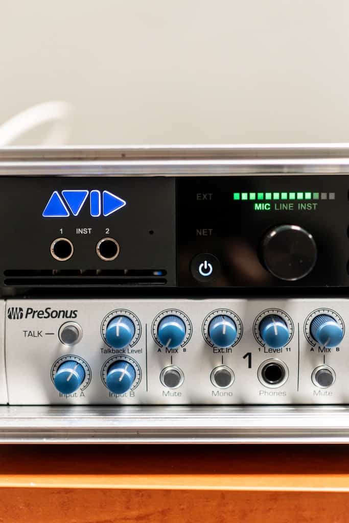 Kolejnym ważnym elementem jest nagłośnienie sceniczne, które oparto o dwa aktywne monitory QSC K12.2 oferujące 126 dB ciągłego SPL oraz posiadające wbudowany wzmacniacz o mocy szczytowej 2000 W. Ich zadaniem będzie zapewnienie odsłuchów występującym muzykom, w związku z tym docelowo mają być ustawiane na scenie zgodnie z aktualnymi potrzebami. Oczywiście monitory mogą być też ustawiane na statywach głośnikowych. Niezależnie od nich, dostarczono także 8 kompletów słuchawek Audio-Technica ATH-M30X wraz ze wzmacniaczami Presonus HP60. Mają one służyć m. in. jako odsłuchy indywidualne podczas nagrań różnych materiałów muzycznych, które będą realizowane w szkole. I właśnie w związku z planowanymi nagraniami zainstalowano także system rejestracji wielokanałowej, umieszczono go w kabinie realizatora, aczkolwiek ma on charakter mobilny (skrzynia typu flight case). Sercem jest laptop z oprogramowaniem typu DAW, a konkretnie z Pro Tools, zestawem wtyczek Waves Silver i Izotope Ozone 9 Standard, a od strony sprzętowej – interfejs Avid Pro Tools Carbon, oferujący 24 kanały wejściowe, sieć Dante oraz wysokiej klasy przedwzmacniacze mikrofonowe. Przewidziano, że wspomniany system będzie wykorzystywany przede wszystkim do nagrywania sygnałów z mikrofonów rozstawionych na scenie i zapisywanych na osobnych śladach w DAW.