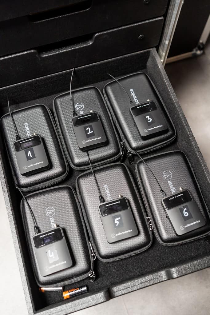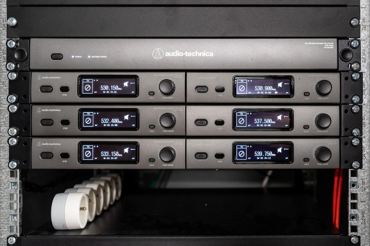Realizacja nagłośnienia odbywa się z reżyserki znajdującej się z tyłu, aczkolwiek niezależnie od tego, w samej sali jest odpowiednie przyłącze, umożliwiające podłączenie konsolety i pracę przy bezpośrednim odsłuchu zestawów frontowych. Szkołę wyposażono w konsoletę cyfrową Allen&Heath Avantis, pozwalającą na pracę z częstotliwością 96 kHz i oferującą 64 kanały oraz 42 szyny miksujące. Avantis posiada dwa ekrany dotykowe, przyjazny interfejs użytkownika i praktycznie wszystko, co jest potrzebne do w pełni profesjonalnej pracy. Z kolei w pomieszczeniu technicznym umieszczono ekspander audio Allen&Heath GX4816, wyposażony w dużą liczbę wejść, 48 przedwzmacniaczy mikrofonowych, czy 2 porty DX. Docelowo ma on służyć do podłączenia systemu mikrofonów bezprzewodowych. Kolejny ekspander Allen&Heath DX168 jest mobilny, został umieszczony w skrzyni i może być wykorzystany w dowolnym miejscu. Skoro już wspomnieliśmy o mikrofonach bezprzewodowych, w szkole zainstalowano 6 kanałów takiego systemu, przy czym odbiorniki pracują w takim zakresie, który gwarantuje stabilną pracę bez zakłóceń. Współpracuje z nimi 6 nadajników typu bodypack oraz mikrofony nagłowne Audio-Technica BP894x i 6 nadajników z dynamicznymi kapsułami kardioidalnymi.