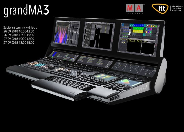 W imieniu firmy LTT zapraszamy na prezentacje i testy najnowszych konsolet MA Lighting serii grandMA3. Najnowszy system reprezentuje radykalną zmianę postrzegania tego, co jest możliwe w sterowaniu oświetleniem. Nowa architektura systemu, skupia się na ergonomii obsługi urządzeń, funkcji i efektów. Organizator przewidział cztery terminy prezentacji: 26.09.2018 – 10:00-12:00 26.09.2018 – 13:00-15:00 27.09.2018 – 10:00-12:00 27.09.2018 – 13:00-15:00 Uczestnictwo wymaga wcześniejszego zarejestrowania się i uzyskania potwierdzenia rejestracji. Rejestracji można dokonać TUTAJ po uprzednim wybraniu dogodnego terminu i wepełnieniu formularza zgłoszeniowego. Warsztaty z prezentacją odbędą się w siedzibie firmy LTT przy ulicy Bakalarskiej 17 w Warszawie.