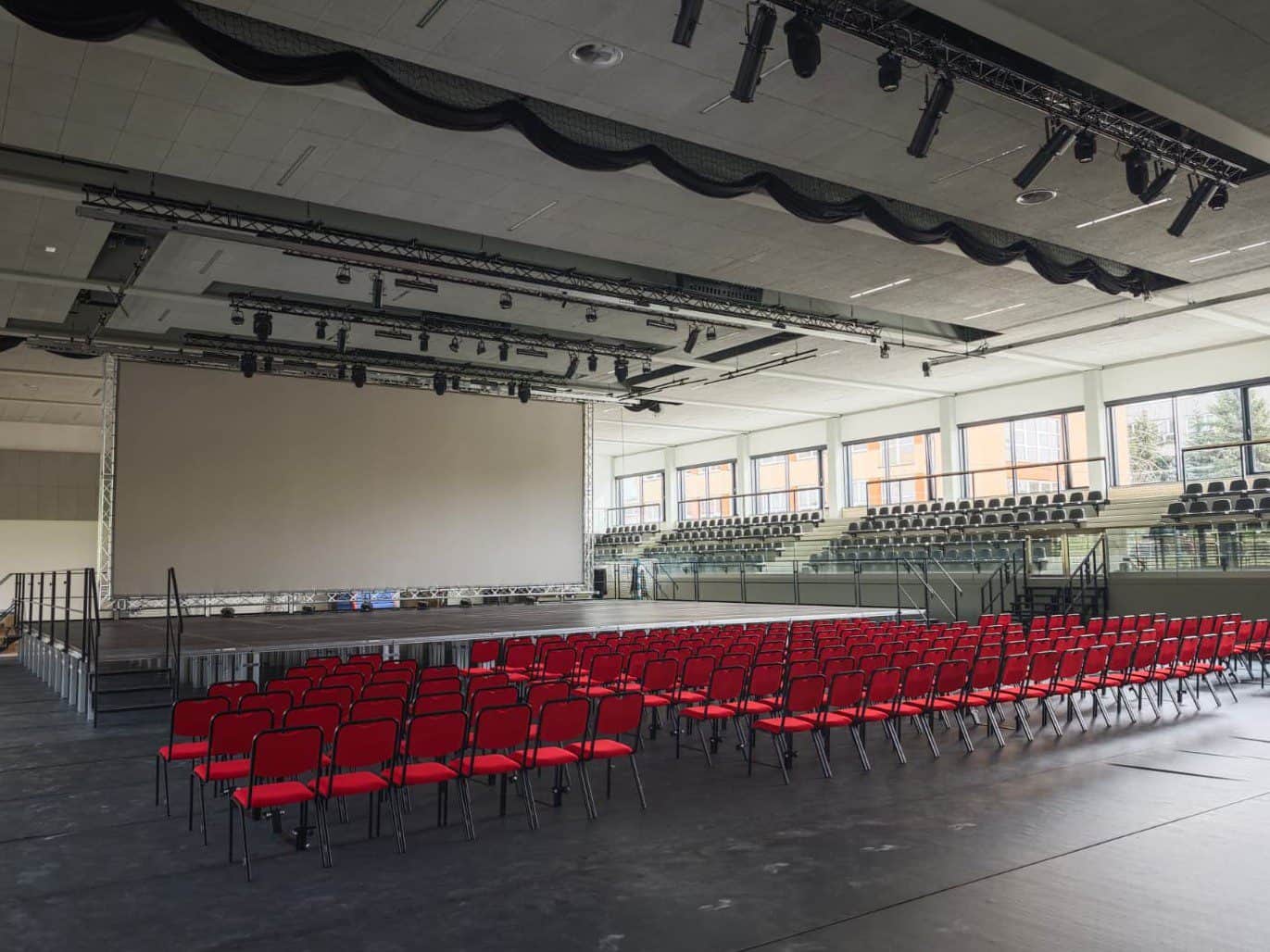 Na szczególną uwagę zasługują podesty elektryczne, które zainstalowaliśmy w Sali Symfonicznej. Piętnaście podestów z napędem łańcuchowym SERAPID tworzy trzyrzędowy łuk. Służą one do zmiany ustawienia konfiguracji sceny.