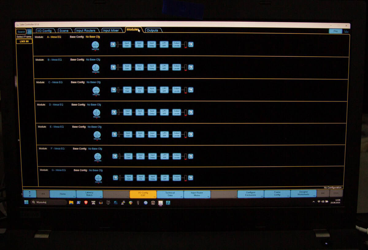 Wspomniałem wcześniej o potrzebie zapoznania się z zakładkami menu Lake Controllera, ale warto podkreślić to jeszcze raz, ponieważ pierwsza z nim styczność może być lekko przytłaczająca. Po rozpoczęciu pracy i wyborze odpowiedniej karty sieciowej, do której podpięty jest jeden z testowanych modeli, należy najpierw zlokalizować moduły MesaEQ i Mesa Contour, przeciągnąć wybraną konfigurację na pole robocze, a następnie, po procesie synchronizacji, rozpocząć dokonywanie operacji takich jak wgrywanie presetów głośników, lub routing wejść i zapisywanie konkretnych scen. Na szczęście w Internecie jest dużo materiałów na ten temat, a wsparcie dystrybutora tym bardziej ułatwi miękki start jeśli chodzi o ten proces. Czynność ta po kilku eventach staje się przyjemna, powtarzalna i wygodna w zakresie personalizacji pewnych rozwiązań.