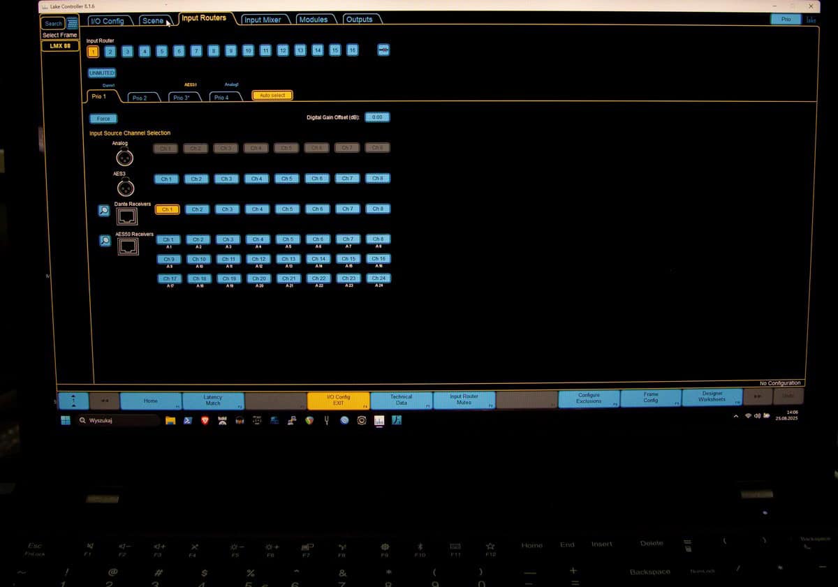 Gniazda sieciowe pozwalają na podpięcie switcha i laptopów sterujących systemem, natomiast dodatkowe gniazdo RJ45 umożliwia przyjęcie sygnału GPI. W ramach ciekawostki dodam dla osób, które nigdy nie miały styczności z tym formatem, lub nie wiedziały jak go wykorzystać, że warto zwrócić się do oficjalnego wsparcia urządzenia, którym jest przedstawiciel SoundTrade – Michał Niezbecki. Na pewno odpowie On na pytania w jaki sposób zaimplementować to rozwiązanie i zapewniam, że niezwykle przyspiesza ono zarządzanie systemem np. poprzez podłączenie zewnętrznego panelu przycisków pozwalających na przywoływanie scen. Dopełnieniem profesjonalnej strony urządzeń jest zastosowanie gniazd sieciowych zapewniających redundancję. W praktyce oczywiście warto zadbać o to, aby każdy przewód zasilający podpięty był do innego źródła zasilania, aby uodpornić zarządzany system np. na spadek napięcia z agregatu, lub uszkodzony przedłużacz prowadzący od rozdzielni do procesora. Oczywiście kluczem do otwarcia wszystkich operacyjnych bram omawianych urządzeń jest oprogramowanie Lake Controller. Pozwala ono na połączenie sieciowe zarządzanej instalacji, wykonanie routingu wewnętrznego wejść i wyjść oraz na dokonywanie operacji na nich. Jego wygląd na pewno znają użytkownicy dawnych urządzeń Dolby Lake. Charakteryzuje się ciemną szatą graficzną z zakładkami menu umieszczonymi w dolnym pasku. Kto kiedykolwiek dokonywał operacji za pomocą tej aplikacji, ten wie jak ważna jest nauka wszystkich lub większości ścieżek menu. Zalecam każdej osobie odpowiedzialnej za konfiguracje i przygotowanie systemów, szczególnie w zakresie zarządzania z pozycji FOH, na zapoznanie się z tym programem i zyskanie pewnej biegłości, ponieważ jest to system często spotykany na festiwalach i w salach koncertowych, a jego obsługa pod warunkiem umiejętności poruszania się po zakładkach, na pewno zaprocentuje w kolejnych realizacjach.