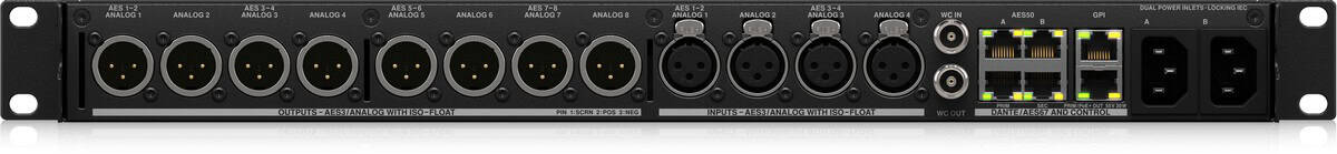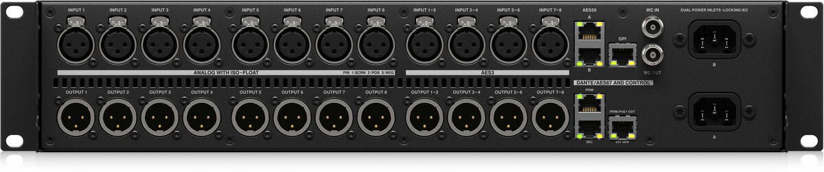 Zaplecze obu urządzeń różni się od siebie, ale w obu przypadkach rozplanowane jest w sposób ergonomiczny i czytelny. Wersja „niższa” zapewnia 8 wejść XLR, na które podać można sygnał analogowy oraz cyfrowy AES/EBU (w tym wypadku używane jest każde nieparzyste gniazdo, aby za pomocą jednego połączenia dostarczyć sygnał stereofoniczny). Również w formacie XLR dostępne są wyjścia urządzenia. Zasada jest taka sama, czyli z pomocą gniazd można wyprowadzić sygnał analogowy oraz cyfrowy AES/EBU. Dostępne są 4 złącza. Model bardziej rozbudowany, czyli LMX88, oferuje serię oddzielnych gniazd wejściowych oraz wyjściowych dla formatów analogowych i cyfrowych. Można więc z powodzeniem przyjmować je oraz „oddawać” na system równolegle. Zastosowano dodatkowo 4 wyjścia więcej w formie analogowej oraz 2 więcej AES/EBU niż w LMX48. Jednak to nie wszystko, ponieważ Labgruppen poszedł o kilka kroków dalej, oferując w obu przypadkach możliwość obsługi sygnałów w standardzie Dante oraz AES50. Zastosowano po 2 gniazda dla obu protokołów, dzięki czemu tworzenie rozbudowanych połączeń staje się jeszcze łatwiejsze i pozwala na wygodne routowanie sygnałów pochodzących z różnych źródeł (i taktowanych przez różne zegary, ale o tym później) na wiele sposobów, zgodnie z założeniami inżyniera systemu. Gniazda In oraz Out obsługujące generator zegara Wordclock, w postaci gniazd BNC, pozwalają na stosowanie urządzeń do tego dedykowanych firm zewnętrznych, aby całość instalacji taktować jednym stabilnym zegarem. Można również traktować LMX48 i LMX88 jako tego typu źródło, podając na wejścia WC innych konsolet wspólny z procesorem sygnał.