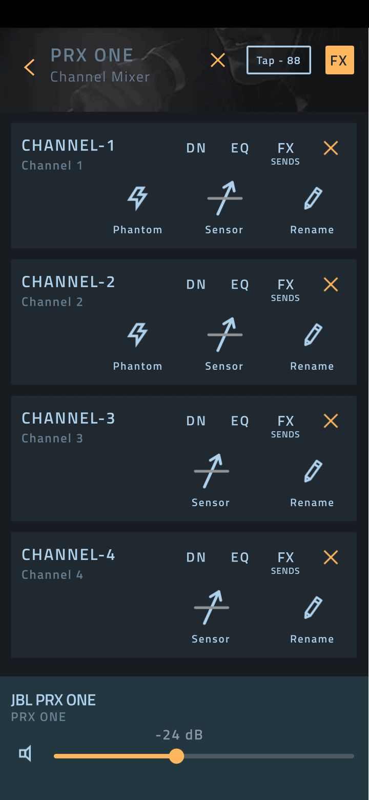 Z tyłu obudowy znajdziemy wszystkie gniazda – cztery pierwsze typu Combo, zatem akceptujące zarówno wtyczki XLR, jak i TRS (jack) 6,3 mm (sygnały mikrofonowe i liniowe). Dla kanałów 1 i 2 możemy włączyć zasilanie Phantom, ale by to zrobić, trzeba wejść w menu edycyjne. Przyznam, że wolałbym rozwiązanie bardziej tradycyjne, po prostu jakiś osobny włącznik. Ponadto fakt aktywności tego zasilania nie jest w żaden sposób sygnalizowany, co potencjalnie może rodzić problemy, jeśli w ferworze pracy zapomnimy o nim i podłączymy coś, co go nie wymaga i czemu może wręcz zaszkodzić. Przydałaby się jakaś ikona na wyświetlaczu albo nawet dioda. Kolejne dwa gniazda to symetryczne wejścia 6,3 mm (TRS/jack, Hi-Z), a także pojedyncze 3,5 mm – stereo (niesymetryczne), tutaj sygnał jest miksowany na wejściu do mono i w takiej postaci wykorzystany dalej. I wreszcie jedyne wyjście (Pass Thru), które wysyła zmiksowany sygnał wszystkich wejść, co możemy wykorzystać np. do nagrania prezentacji, dalszej dystrybucji itd. Mamy tu zresztą kilka wariantów – na wyjściu może się znaleźć pełny sygnał, sam dół (w celu skierowania go do subwoofera), możemy też filtrować go indywidualnie, w zależności od tego, co potrzebujemy. Wspomnę jeszcze, że w takim wypadku (tworzenia łańcucha urządzeń) omawiany model pozwala na kompensację czasową (opóźnianie sygnałów), jeśli tylko zajdzie taka potrzeba. Mikser PRX ONE oferuje dwa tryby pracy, Mix i Channel Strip. Pierwszy z nich pozwala na szybkie ustawianie poziomu każdego kanału za pomocą indywidualnych enkoderów. Drugi uaktywnia edycję wybranych parametrów konkretnego kanału, wówczas enkodery kontrolują trzypasmowy korektor, poziomy wysyłki do pogłosu, opóźnienia i chorusu. Dzięki temu możemy szybko skorygować najważniejsze ustawienia – oczywiście dostęp do wszystkich parametrów uzyskamy dopiero po wejściu w menu edycyjne.