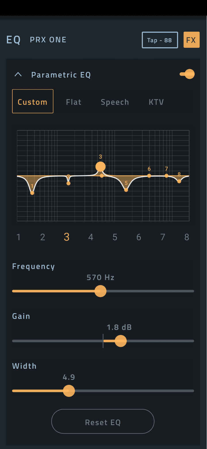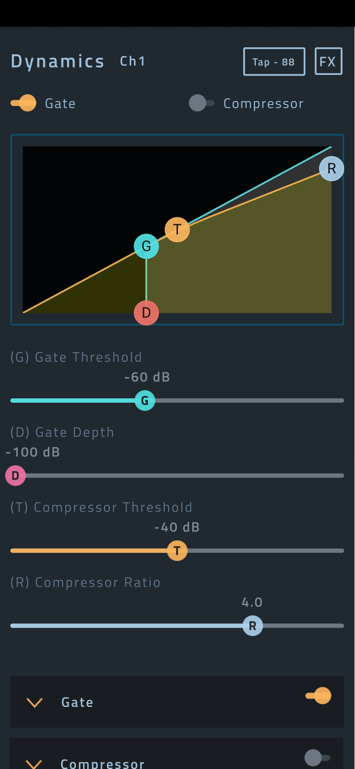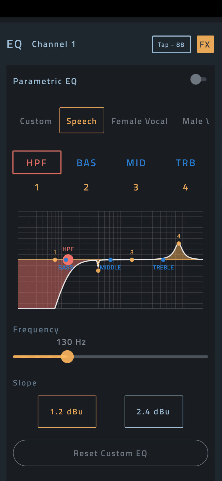 Kolejną funkcją, tym razem zapożyczoną od dbx (DriveRack), jest AFS (Automatic Feedback Supression), czyli automatyczna eliminacja sprzężeń, rzecz bardzo przydatna, zwłaszcza gdy korzystamy z mikrofonów i istnieje ryzyko, że wystąpi taki problem. Mamy zresztą kolejne algorytmy dbx, które przetwarzają sygnał wyjściowy, jak Master EQ, parametryczny korektor pozwalający na ustawianie częstotliwości, tłumienia i szerokości pasma (Q) – a tych w sumie jest 8. Za nim w torze audio znajduje się limiter (brick wall), także edytowalny i dający użytkownikowi spore pole do działania. Powtórzę raz jeszcze, że efekty w tej sekcji oferują po kilka presetów, pozwalających wybrać coś najbardziej odpowiedniego do konkretnej sytuacji, ale także możliwość samodzielnego określenia ustawień. Omówione przed chwilą efekty mają charakter globalny (master), przypomnę jedynie, że w trybie Channel Strip określamy indywidualne poziomy wysyłki sygnału z każdego kanału miksera do poszczególnych bloków. Niezależnie od Master FX mamy także do dyspozycji efekty kanałowe. Na każdym wejściu możemy aktywować bramkę (bardzo wartościowy dodatek), kompresor, HPF (filtr górnoprzepustowy) oraz prosty, trzypasmowy korektor (bass/middle/treble).