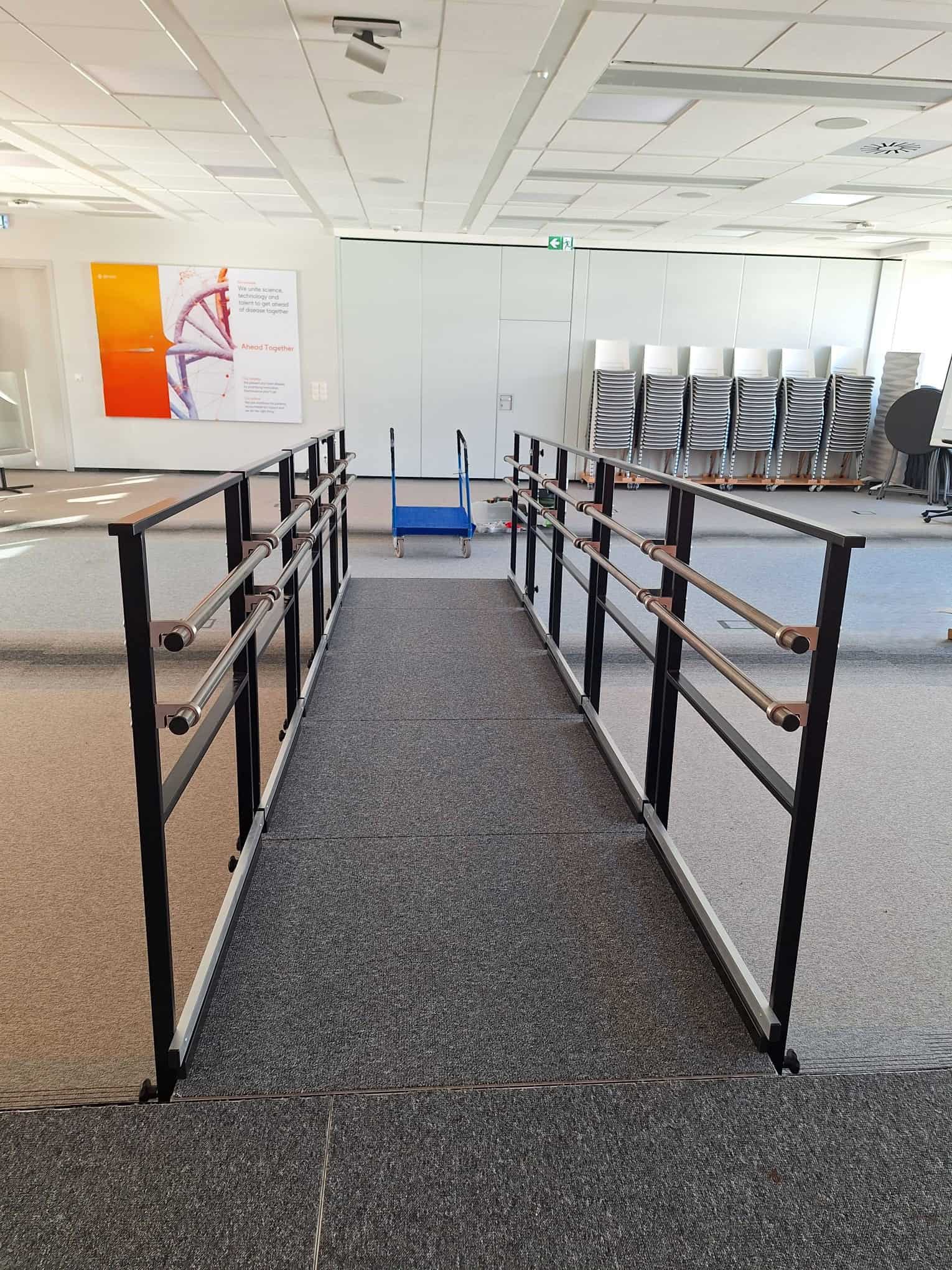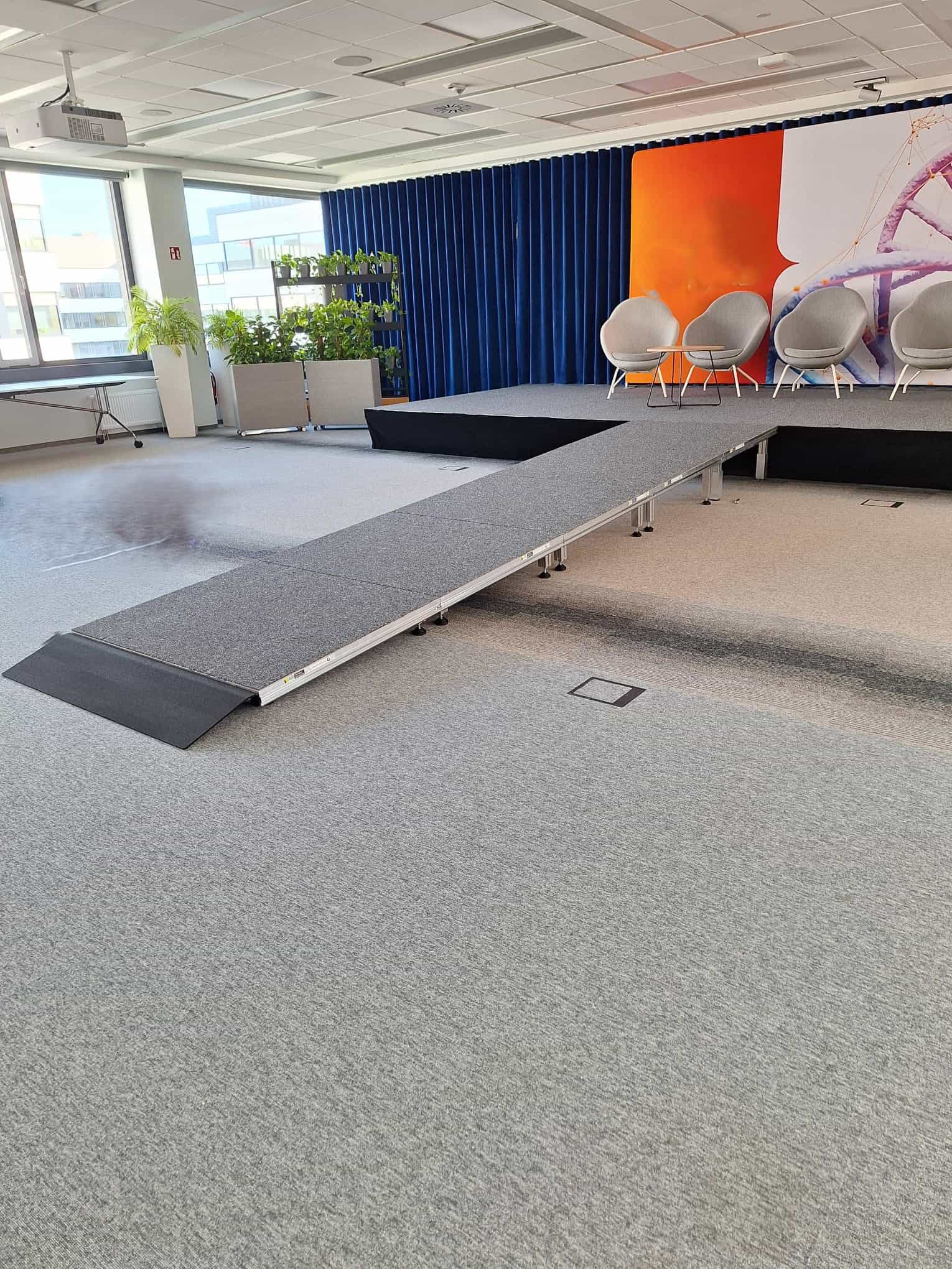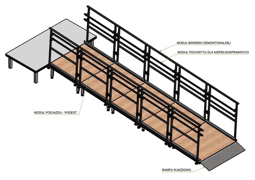 Rampa została skonstruowana w oparciu o system podestów scenicznych BSC, co pozwala na jej pełną integrację z infrastrukturą sceniczną i zachowanie estetyki sceny. Dzięki modułowej budowie możliwe jest dopasowanie długości i kąta nachylenia rampy do konkretnych warunków przestrzennych, bez konieczności ingerencji w konstrukcję obiektu.