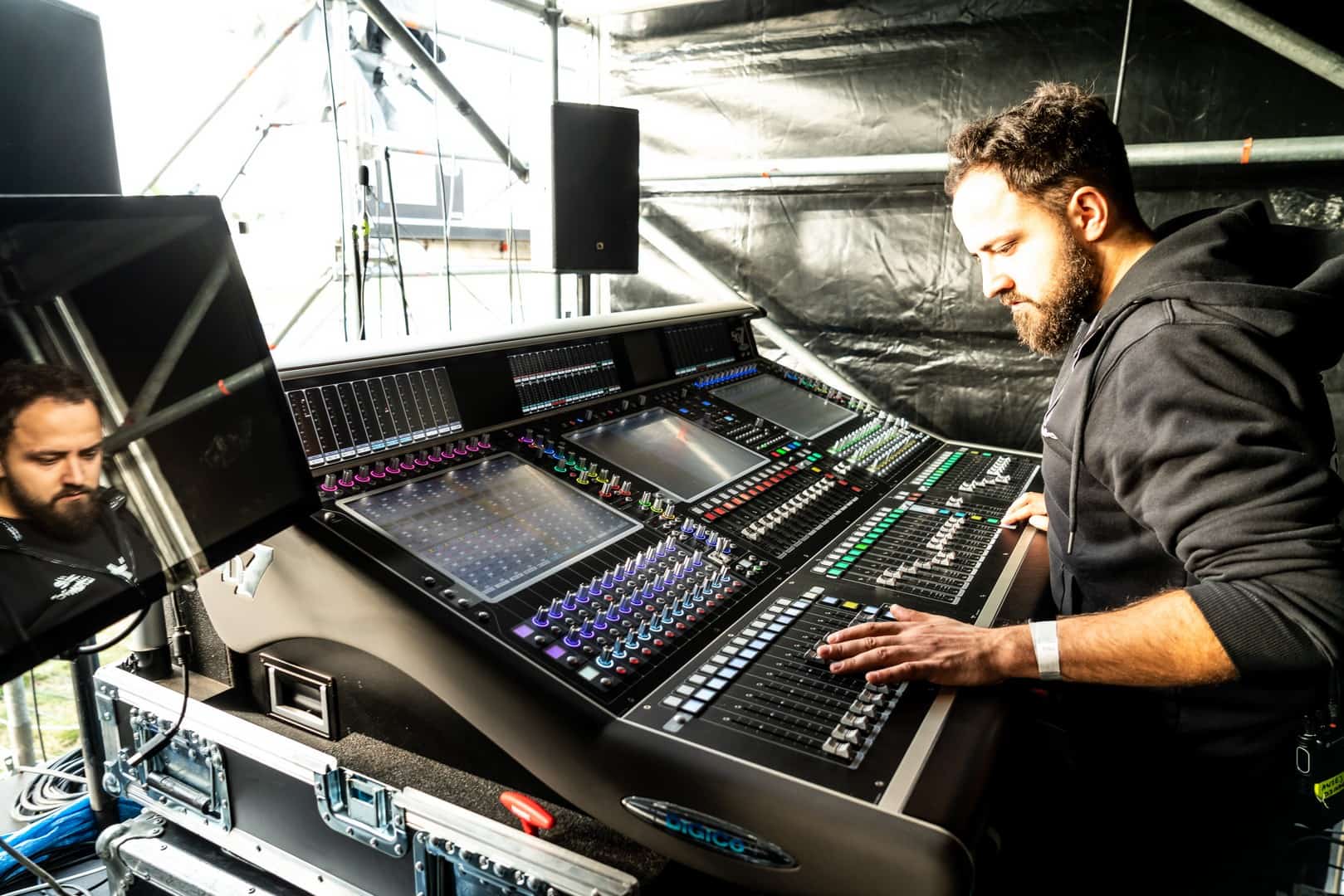 FOH: Digico SD7 Quantum MON: Digico SD7 Pętla Optocore (konsoleta FOH – SD RACK na scenie)