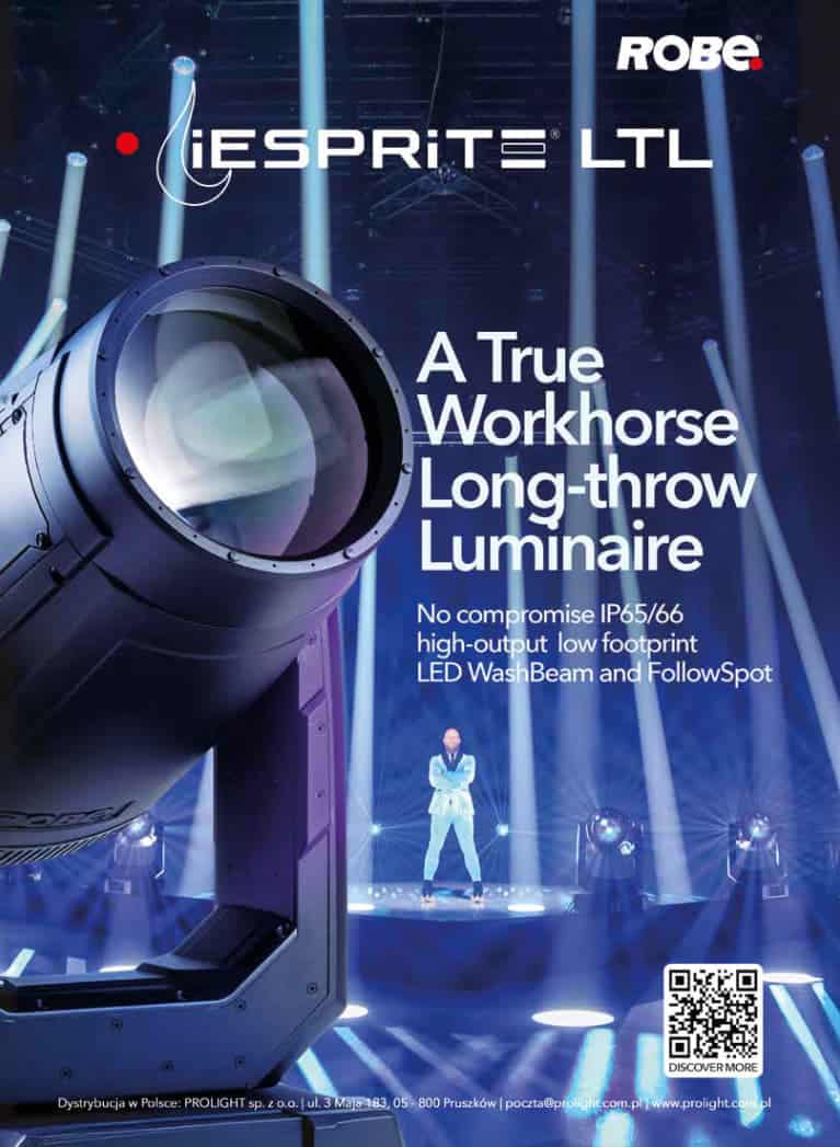 Firma Robe zaprezentowała niewielkich rozmiarów WashBeam. Oprawa bazuje na jednym źródle światła LED RGBW (COB) o mocy 60 W ze specjalnie zaprojektowanym obiektywem o średnicy 110 mm, wytwarzającym spójną wiązkę światła. Robe Spikie cechuje się płynnym zoomem od miękkiej plamy o szerokości 28° do ostrych krawędzi beam o szerokości 4° lub jednego z dwóch efektów, dzięki którym nie będziemy mogli oderwać oczu od przedstawienia. Innowacyjny Flower Effect tworzy jasne wielobarwne wiązki światła, obracające się w obu kierunkach ze zmienną prędkością. Unikalny silnik Beam Effect przekształca strumień wyjściowy w potrójny dynamiczny promień, co tworzy kolejny nowy efekt wizualny do pokazu. Ciągła rotacja pan (540°) i tilt (360°) umożliwia tworzenie interesujących dynamicznych efektów na scenie. Spikie oferuje wirtualną tarczę kolorów z sześćdziesięcioma sześcioma gotowymi próbkami LEE, dwunastoma równoważnymi kolorami Robin BMFL i dziesięcioma kolorami użytkownika. To jednak nie wszystko – prezentowany WashBeam ma do dyspozycji efekty kolorów tęczy w obu kierunkach z różną prędkością, trzykrotne rotacyjne obracanie pryzmatu w obu kierunkach (także z różnymi prędkościami), tworzenie spektakularnych efektów wiązki w powietrzu, efekt stroboskopowy ze zmienną prędkością, w którym maksymalnie możemy uzyskać dwadzieścia błysków na sekundę. Wysoka rozdzielczość elektronicznego ściemniania pracującego w zakresie od 0 do 100% i zaprogramowane losowe efekty stroboskopowe i impulsowe gwarantują widzą niepowtarzalne wrażenia. Spikie to urządzenie lekkie (7,3 kg), kompaktowe i łatwe w obsłudze, które można zamontować w każdej pozycji.