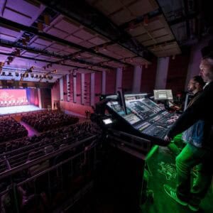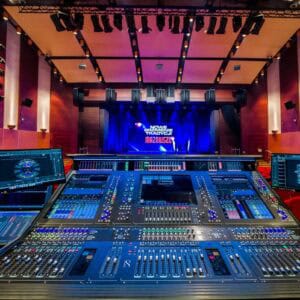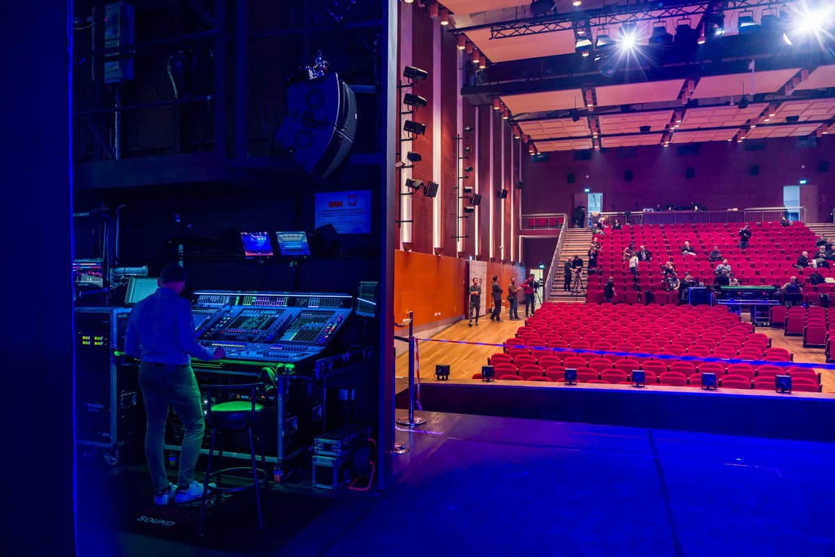 Widok ze sceny. Po lewej stronie konsoleta DiGiCo Quantum 852 na stanowisku monitorowym.