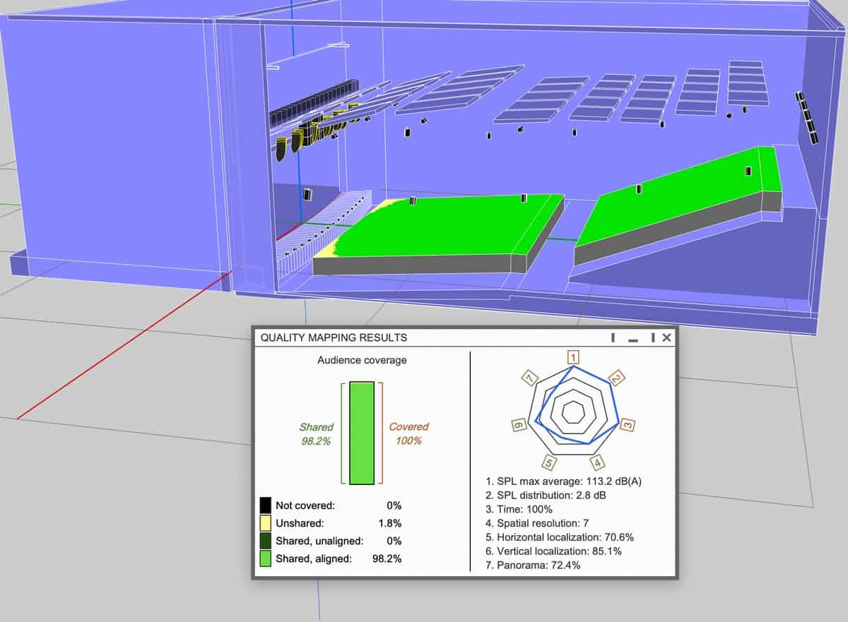 Jak wspomniałem na początku system aktywnej akustyki był kiedyś w planach lecz nie mógł być zrealizowany z przyczyn niezależnych od producenta technologii. Oczywiście nadal można go w przyszłości dołożyć lecz najpierw trzeba dostosować scenę i sale widowiskową do wytycznych dla technologii wykorzystującej aktywną akustykę. Mówiąc o pokryciu widowni dźwiękiem to pokrycie jest 100% lecz nie to jest najważniejsze. Najważniejsza jest nierównomierność tego pokrycia a ta wynosi tylko 2,8 dB i do tego tylko w zakresie pasma 8kHz – 16kHz oraz tzw L-ISA Zone – strefa, w której siedzące osoby doznają wrażenia dźwięku immersyjnego. W projekcie Sali Widowiskowej Mazowsza udało się uzyskać L-ISA Zone powyżej 98% co stanowi doskonały wynik i praktycznie każdy widz może doznać wrażenia efektów przestrzennych. Oczywiście bardzo pomocny okazał się immersyjny frontfill, który poza swoją typową rolą uzupełnienia pokrycia zapewnia także dźwięk przestrzenny i bardzo dobrze odwzorowuje obraz dźwiękowy pochodzący ze sceny. Możemy zatem przyjąć, że założenia projektowe zostały spełnione.