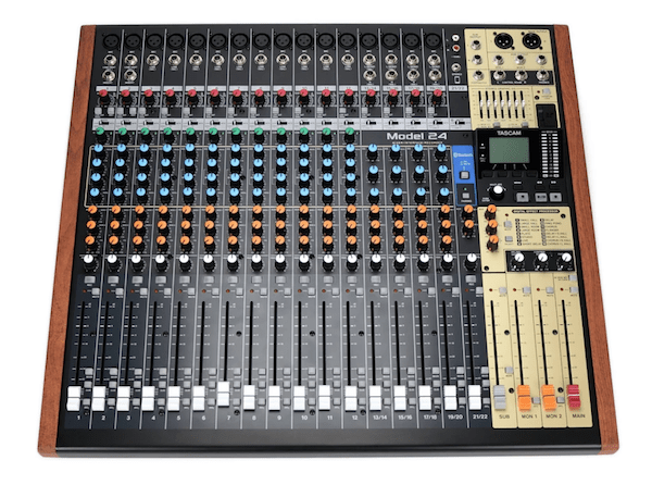 Tascam zaprezentował mikser analogowy z wbudowanym rejestratorem wielośladowym oraz interfejsem audio USB. Model 24 kolorystycznie nawiązuje do mikserów marki Tascam z czasów, gdy cyfrowe sprzęty nie były dostępne. Jednak w środku urządzenia znajdziemy najnowsze technologie znane z Portastudio. Na pokładzie miksera umieszczono dwadzieścia dwa tłumiki o długości 100 mm, które znacząco usprawniają proces miksowania. Producent wyposażył mikser w dwa dodatkowe tłumiki przeznaczone do ustawienia głośności na wyjściu, sumie i monitorach.Model 24 oddaje do naszej dyspozycji dwanaście monofonicznych wejść, na każdym z nich znajdziemy mikrofonowe złącza na XLR i liniowe jack 1/4 cala. Dwa pierwsze wejścia obsługują sygnał instrumentalny. Nowy mikser ma także cztery kanały stereofoniczne z pojedynczym wejściem XLR (mikrofon) i dwoma wejściami jack 1/4 cala (kanał lewy i prawy). W razie potrzeby umożliwia to podłączenie szesnastu mikrofonów. Stereofoniczne kanały 21/22 wyposażone zostały w niesymetryczne złącza zrealizowane na XLR; możemy przez nie wprowadzić sygnał audio transmitowany przez Bluetooth. Na każdym z dwunastu wejść monofonicznych znajdziemy filtr górnoprzepustowy, kompresor i trzypasmową korekcję z przestrajanym środkiem. Stereofoniczne kanały zostały wyposażone w filtr górnoprzepustowy i trzypasmową korekcję, a na sumie znajdziemy siedmiopasmowy korektor graficzny. Rejestrator ma także multiefekt z pogłosem, opóźnieniem, chorusem i flangerem.Tascam Model 24 pozwala rejestrować do dwudziestu czterech śladów w rozdzielczości 24 bit i jakości 48 kHz (dwadzieścia dwa kanały i suma) i odtworzyć dwadzieścia dwa ślady przez port USB lub bezpośrednio z poziomu karty SD. Zapisując ślady na SD, mamy możliwość rejestrowania dogrywek, skorzystania z sekcji transportu i manualnego ustalania punktów punch in/out. Bogato wyposażone urządzenie sprawdzi się zarówno w studiu, jak i na scenie.