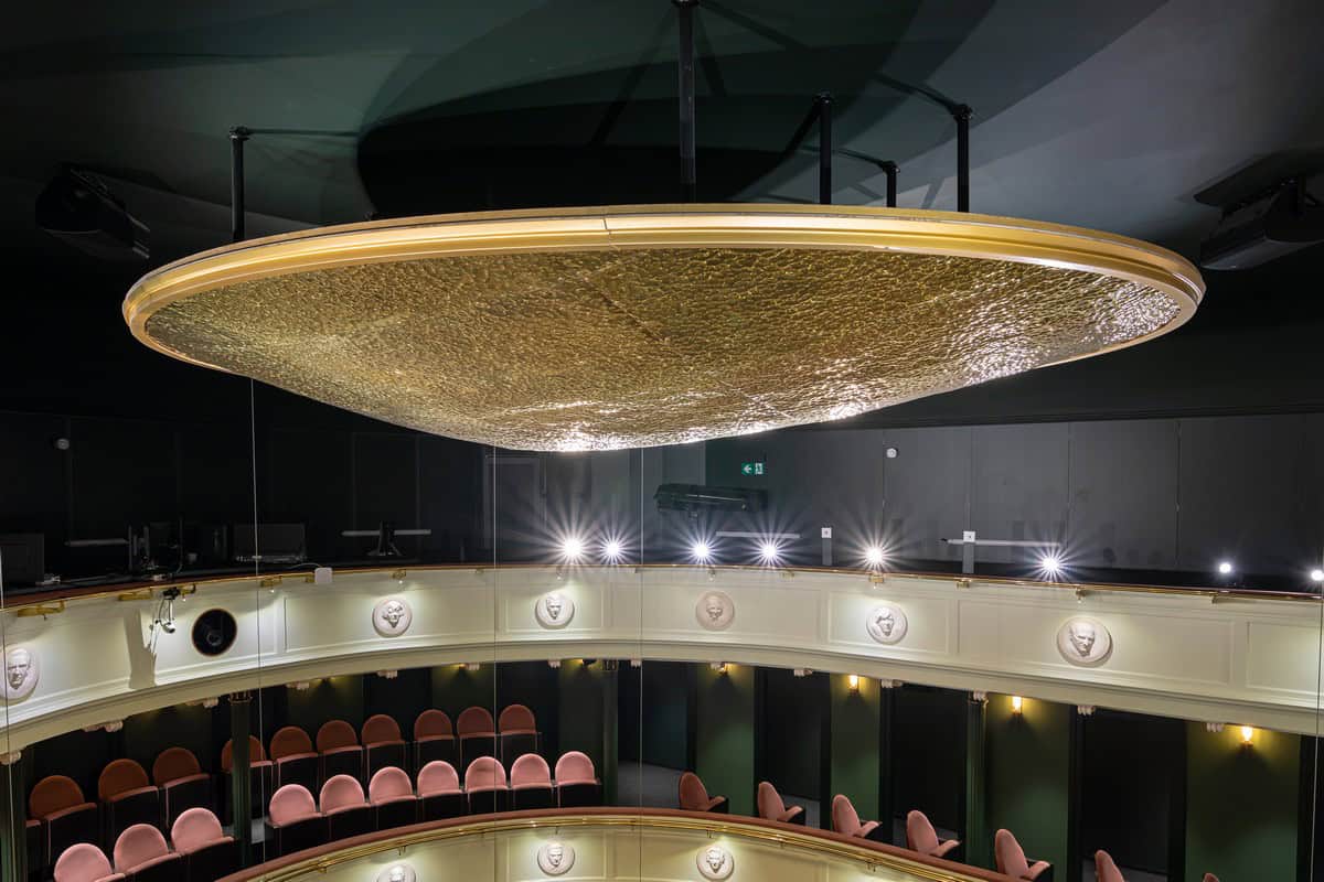 Nad publicznością zawieszono imponujący, trzytonowy plafon wykonany z ręcznie młotkowanej mosiężnej blachy, który dodatkowo wzbogaca doznania akustyczne całej sali.