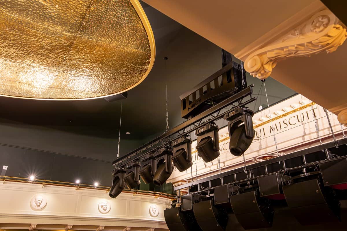 Ze względu na wymiary sceny oraz wysokość komina scenicznego, a także wynikające z tego odległości do miejsca montażu urządzeń, zastosowano urządzenia o wysokiej jasności i szerokim wachlarzu efektów scenograficznych. Na mostach oświetleniowych nad sceną zamontowano ruchome głowice Elation Fuze MAX (łącznie 12 sztuk w wersji SPOT / PROFILE), wyposażone w źródło LED (RGBMA) o mocy 800 W, dostarczające moc ponad 21 000 lumenów. Uzupełniono je o 20 sztuk dobrze znanych na rynku estradowym urządzeń efektowych CLF POSEIDON WASH XL. Na froncie, nad widownią, zamontowane zostało 6 sztuk Elation Artiste Picasso, odpowiedzialnych za precyzyjne kadrowanie i animację wiązek świetlnych o mocy ponad 23 000 lumenów, przy zachowaniu bardzo wysokiej kultury pracy. Ponadto główny system oświetlenia wspierany jest przez mniejsze, lecz również funkcjonalne modele, działające zamiennie lub równolegle na pozostałych scenach w teatrze. Spośród nich wyróżnia się 6 głowic DTS ALCHEMY WASH 5, wyposażonych w tradycyjną soczewkę Fresnela oraz zaawansowany moduł LED, gwarantujący perfekcyjne odwzorowanie kolorów (CRI > 98), oraz 12 ruchomych głów typu wash DTS NICK 1401. Zadania reflektorów typu spot realizują mniejsze urządzenia z serii wcześniej wspomnianych – ELATION Fuze SFX.